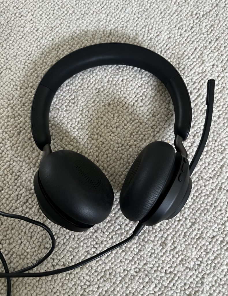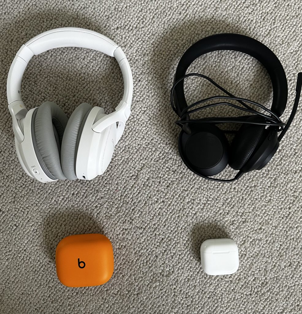 Pierwsza para to słuchawki służbowe do spotkań online. Są trochę bardziej wypasione niż takie zwykłe. Mają dodatkową funkcję wyciszenia otoczenia, ale ponieważ są nauszne ale nie całkowicie nauszne (jak model poniżej) to ta funkcja działa tak sobie. Kiedy zaczęłam pracę w nowej firmie dostałam £250 na wyposażenie domowego biura. Ponieważ domowe biuro miałam już nieźle wyposażone to kupiłam porządne słuchawki, porządną kamerkę oraz mniej porządną klawiaturę i mysz. Dzisiaj wiem, że trochę przesadziłam z tymi słuchawkami. Obecnie korzystam z nich tylko kiedy mam jakieś spotkanie online w biurze, co zdarza się dość rzadko.