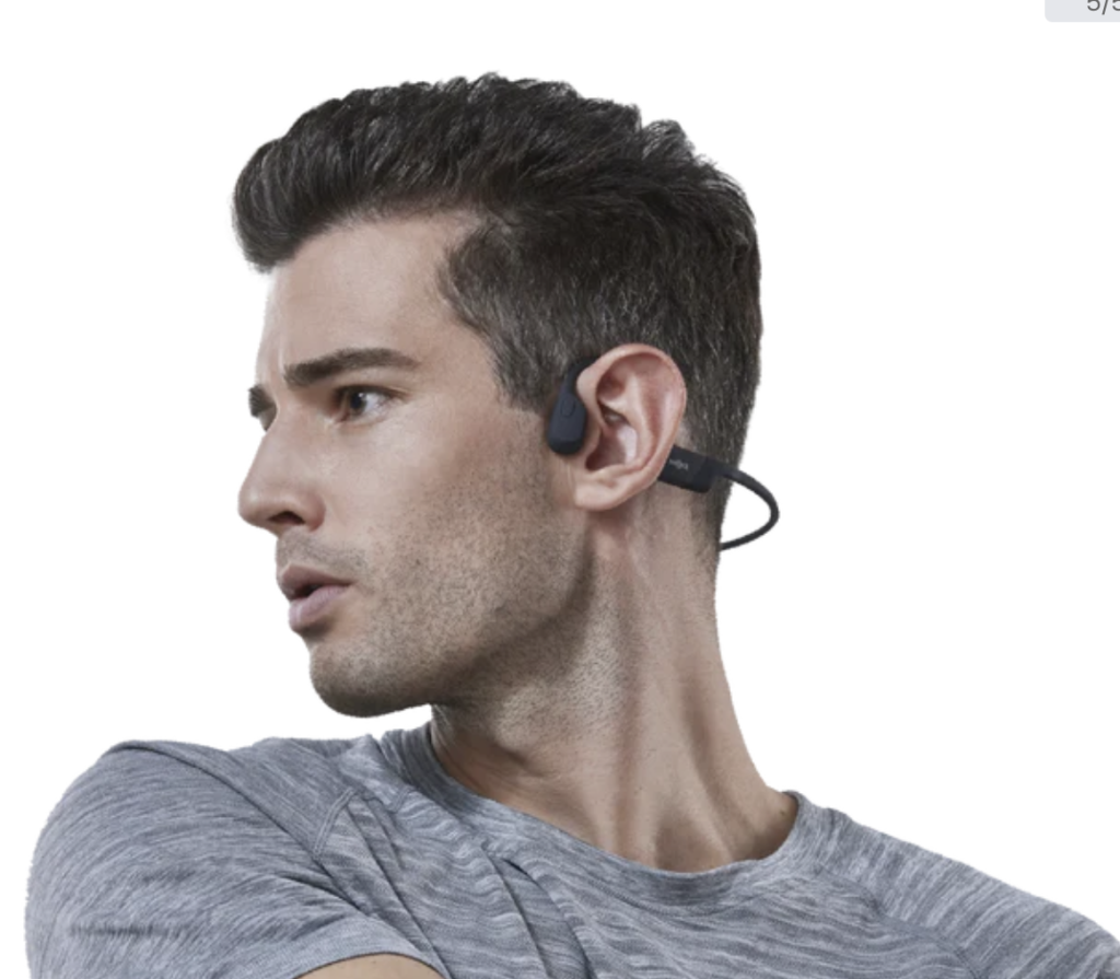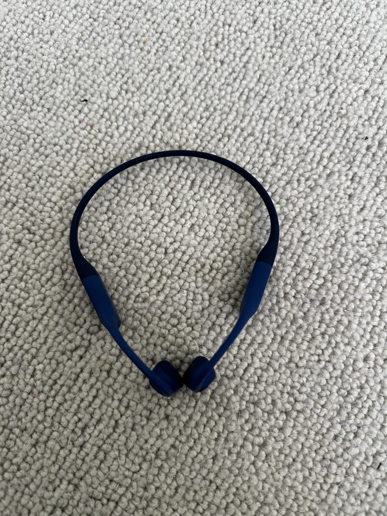 I na koniec mały bonus. To nie są moje słuchawki, to słuchawki mojego męża. Otóż on nie lubi wkładać niczego do ucha. Ma parę słuchawek wyciszających do samolotu, takie jak moje tylko czarne. A do biegania (choć ostatnio raczej używane przy koszeniu trawy) ma słuchawki Shokz. Tych nie wkłada się do ucha ale umieszcza na około ucha, a dźwięk ‘niesie się po kościach’.