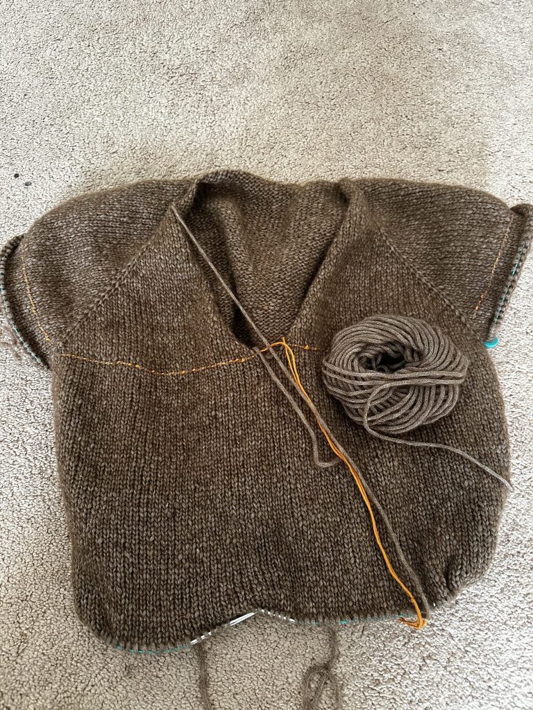 Od jakiegoś czasu dziergam sweterek z dekoltem w serek z tego ‘udawanego’ Drops Air w kolorze Acorn. Serio, mam wrażenie, że te motki to jakaś wybrakowana partia.