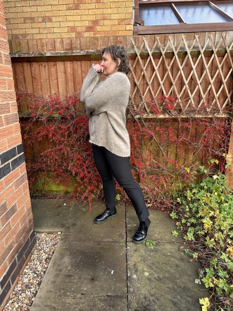 Czas na bonus. Beżowe bojówki są już dawno skrojone ale nie miałam jeszcze czasu aby je uszyć. Udało mi się jednak zrobić zdjęcie swetra, który już pokazywałam. Stylizacja jest nieco inna niż planowałam, ale teraz tak go noszę. O swetrze pisałam więcej tutaj (klik) a tak prezentuje się na ludziu: