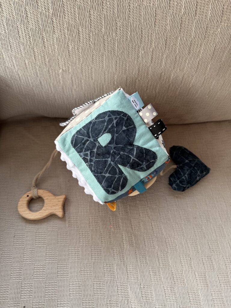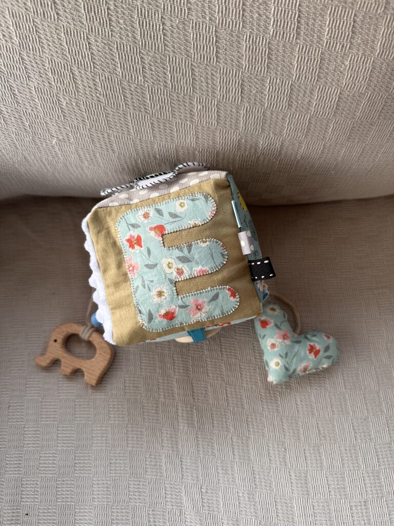A to rzutem na taśmę uszytek z ostatniego weekendu. Kolejne kostki sensoryczne. Jedna dla chłopca o imieniu River, który swoimi narodzinami uczynił małe Pimposhki ciociami! Kuzyn mojego męża bardzo wcześnie został ojcem, River to jego wnuk. Druga to kostka dla drugiej córki mojego byłego szefa. Skoro zrobiłam kostkę Matyldzie, to podobną zrobiłam dla Edith.