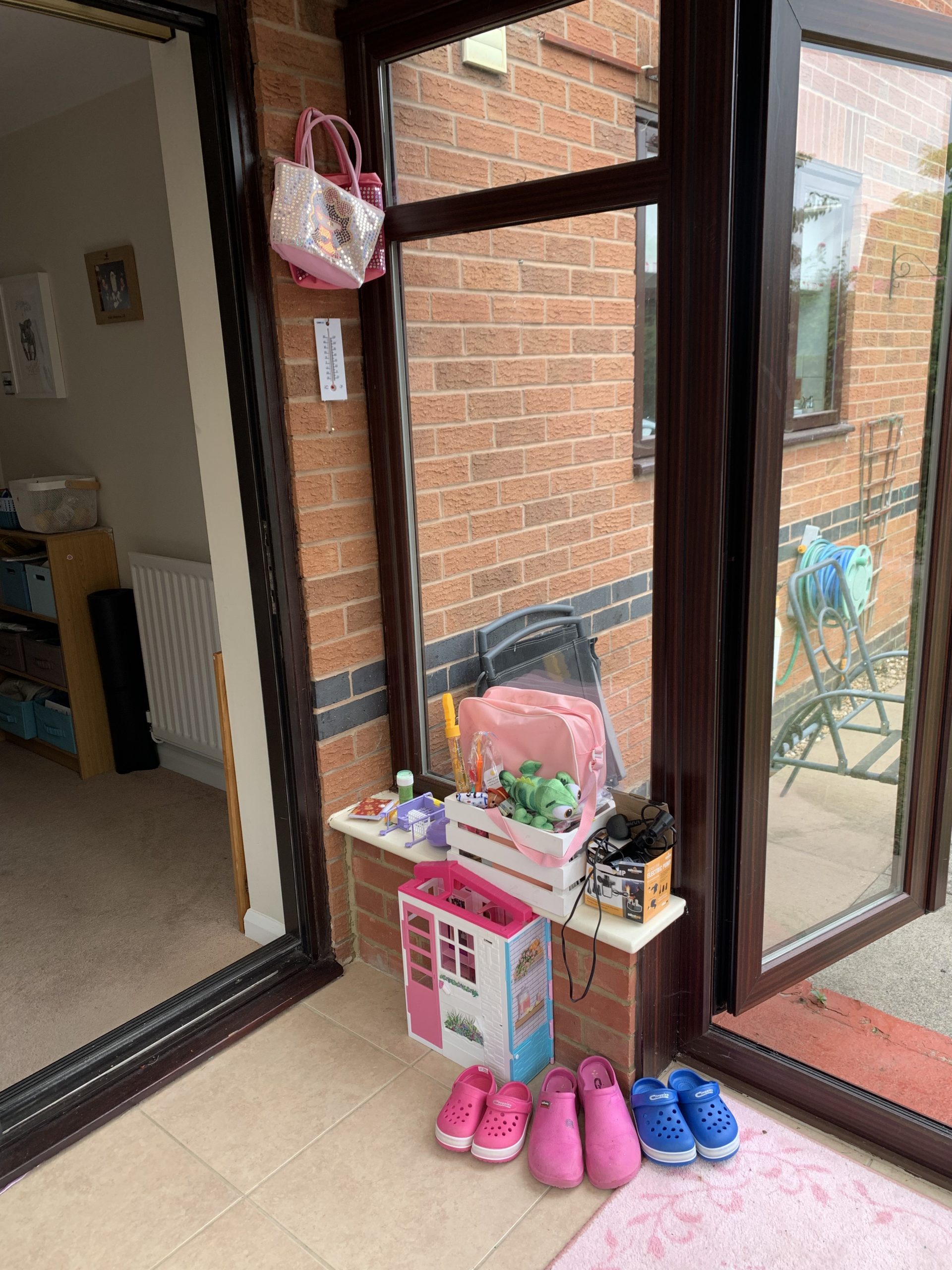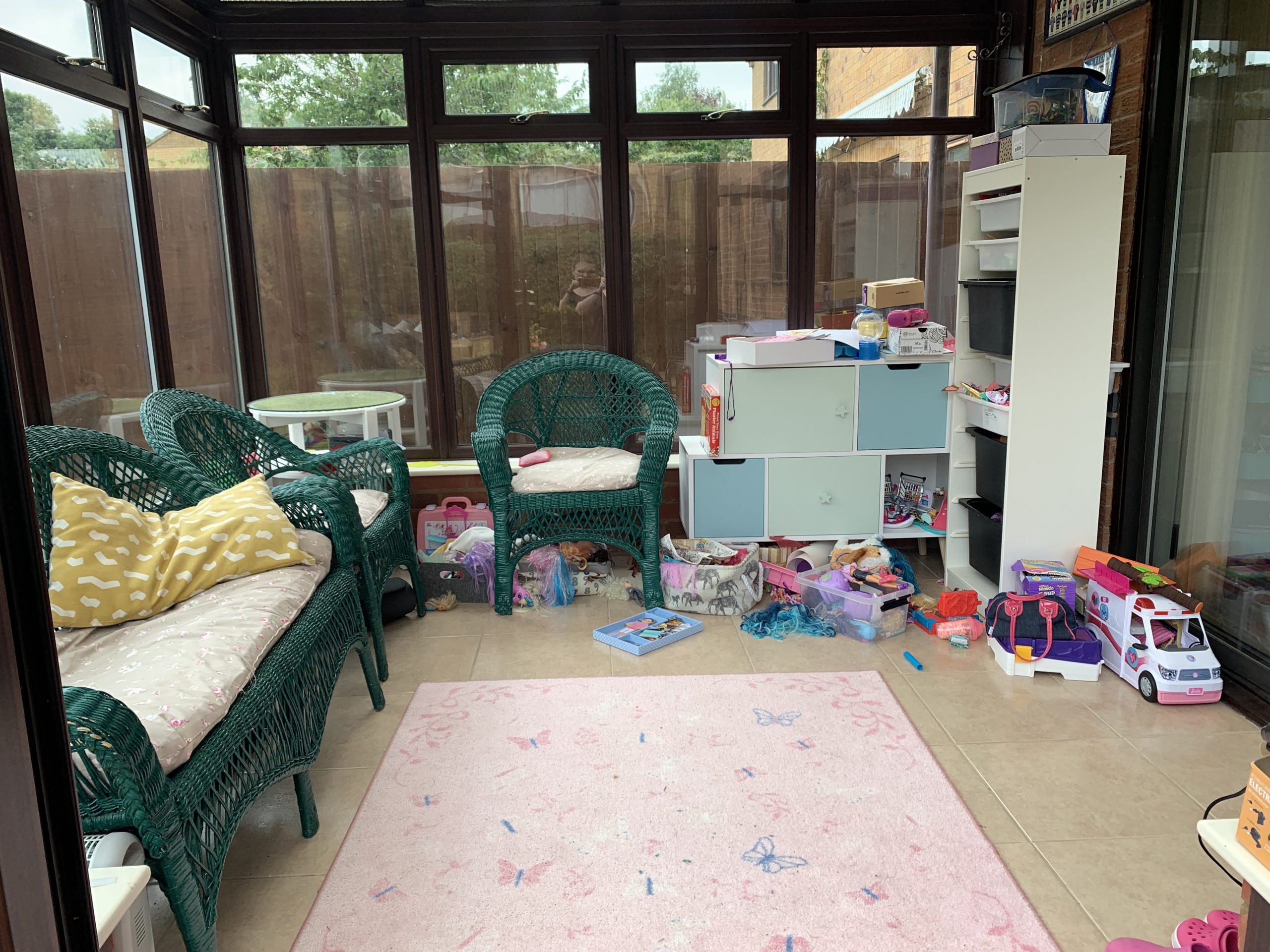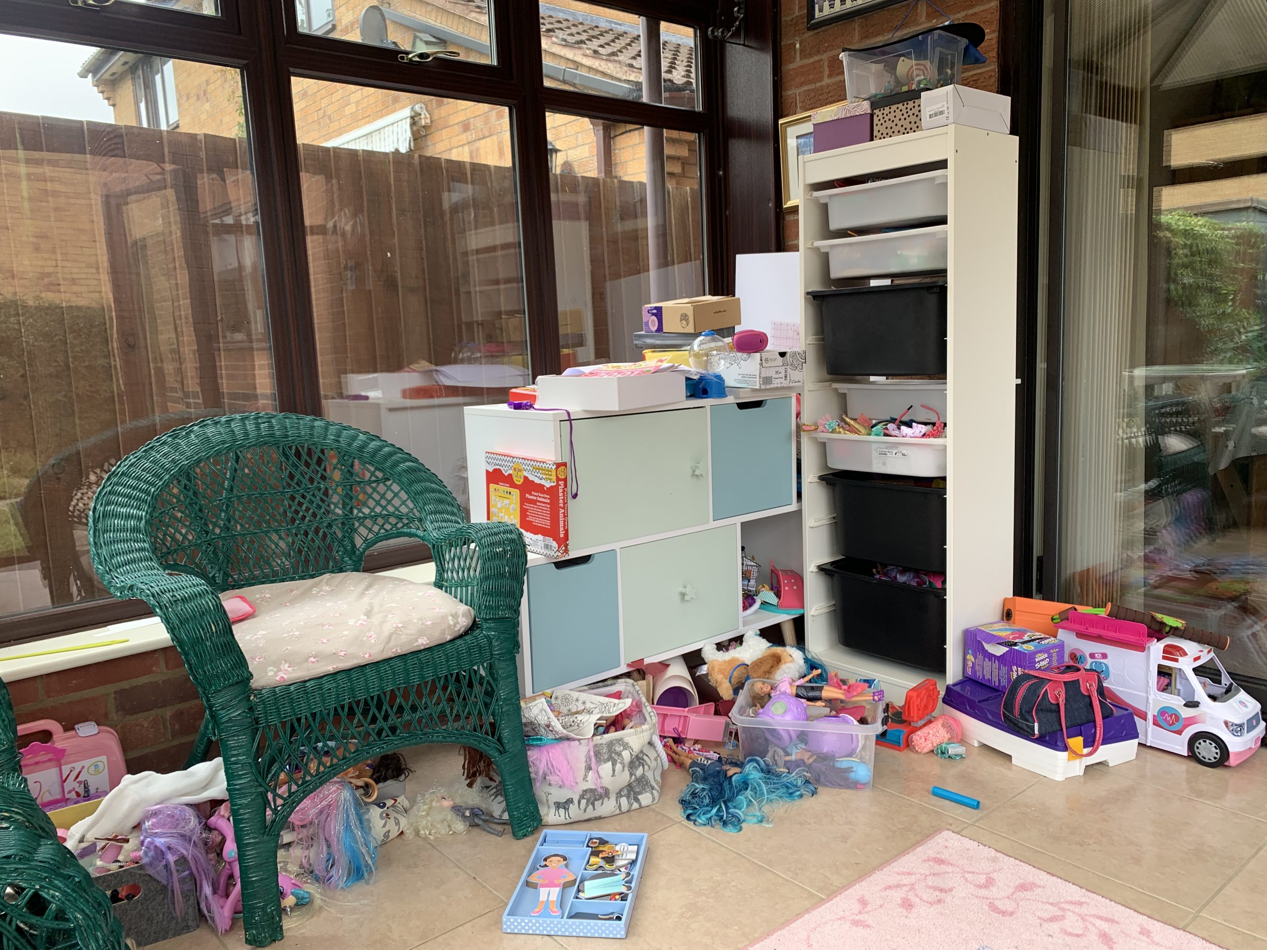 To jest i będzie pokój wielofunkcyjny: bawialnia, pokój do relaksu i pokój do ćwiczeń. Jak widzicie na zdjęciach na razie to jedna wielka bawialnia (ostatnio też służy nam jako ‘domek basenowy’ kiedy dziewczyny chlapią się w ogrodzie to tam czekają na nie ręczniki i ubrania na zmianę). Zabawki już dawno wymknęły się spod kontroli co widać na zdjęciach. Jestem jednak wdzięczna, że nie mamy tego już w salonie i jadalni jak to było w MAD.