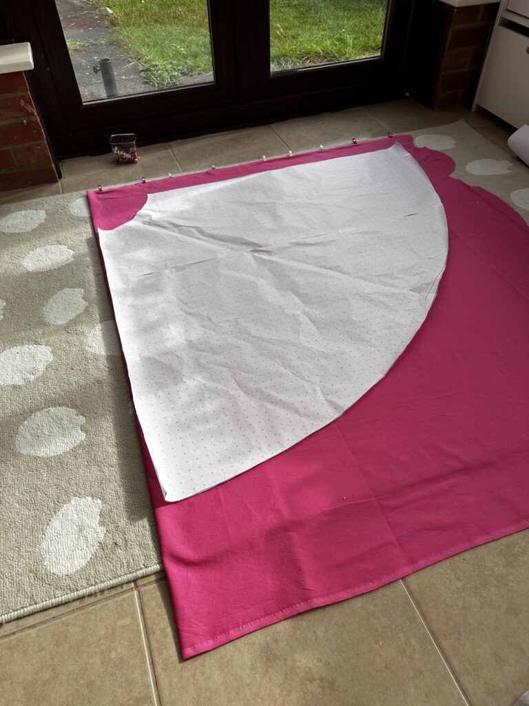 Spódnica miała być z pełnego koła, z kieszeniami (wiadomo!) i na szerokiej gumie. Spódnica z satyny była na zamek. Wykrój zrobiłam sama korzystając z ‘przepisu na spódnicę z koła’ na stronie Ultramaszyny (klik), przypomniałam sobie co to jest promień i liczba pi :). Wykrój kieszeni zapożyczyłam z satynowego modelu. O mało co (o jakieś 5 cm) nie pożałowałam, że pożyczyłam sobie trochę materiału na kapelusz (klik), ale na szczęście wystarczyło.