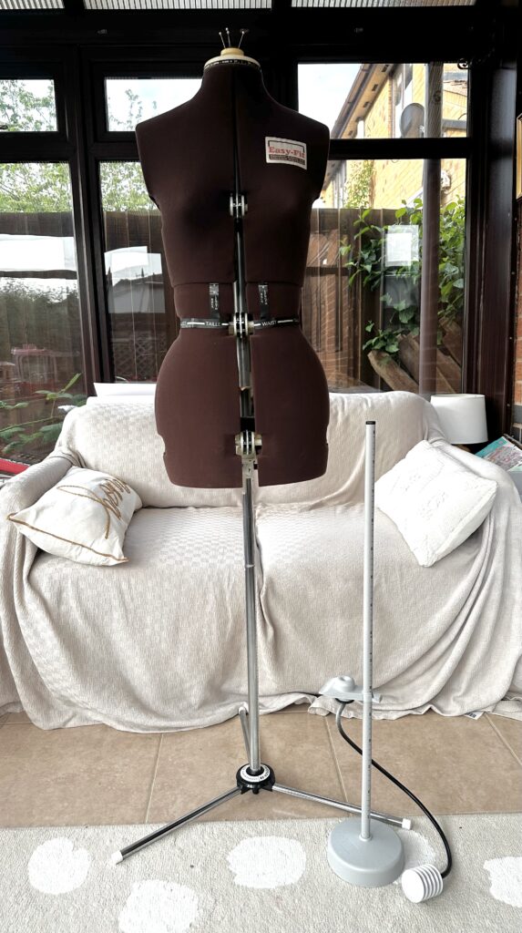 Manekina znalazłam na Gumtree, jest z drugiej ręki i ‘wintedż’, przeleżał u kogoś na strychu sporo lat ale jest w super stanie. Jedyny problem to taki, że ma wymiary ciutkę mniejsze niż moje. Jest motywacja, aby zrzucić trochę ciała hi hi. Dokupiłam do niego pompkę na kredę i mogę już profesjonalnie cyrklować spódnice!