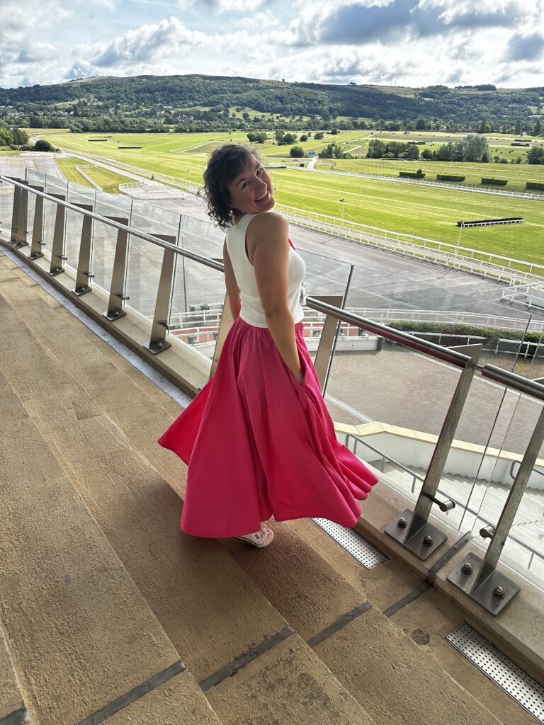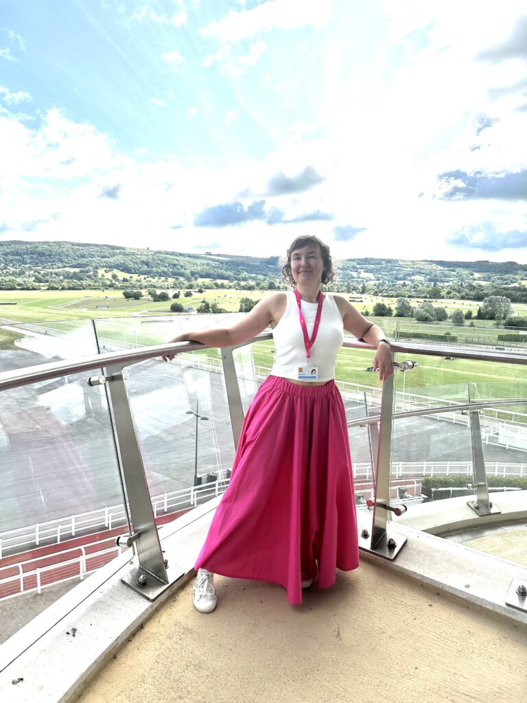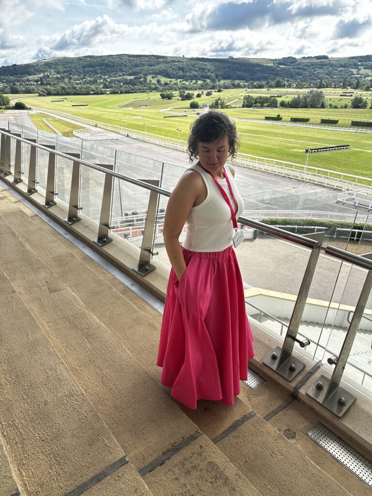 Warunki meteorologiczne się poprawiły, miałam nawet fajną miejscówkę do zdjęć. Otóż spódnica miała swoją premierę na naszym ogólnofirmowym dniu integracyjnym na torze wyścigów konnych. Nie powiem, zadałam szyku a komplementów odebrałam tyle, że ho ho ho. Niestety fotografka trafiła mi się kiepska, więc mam tylko trzy zdjęcia: