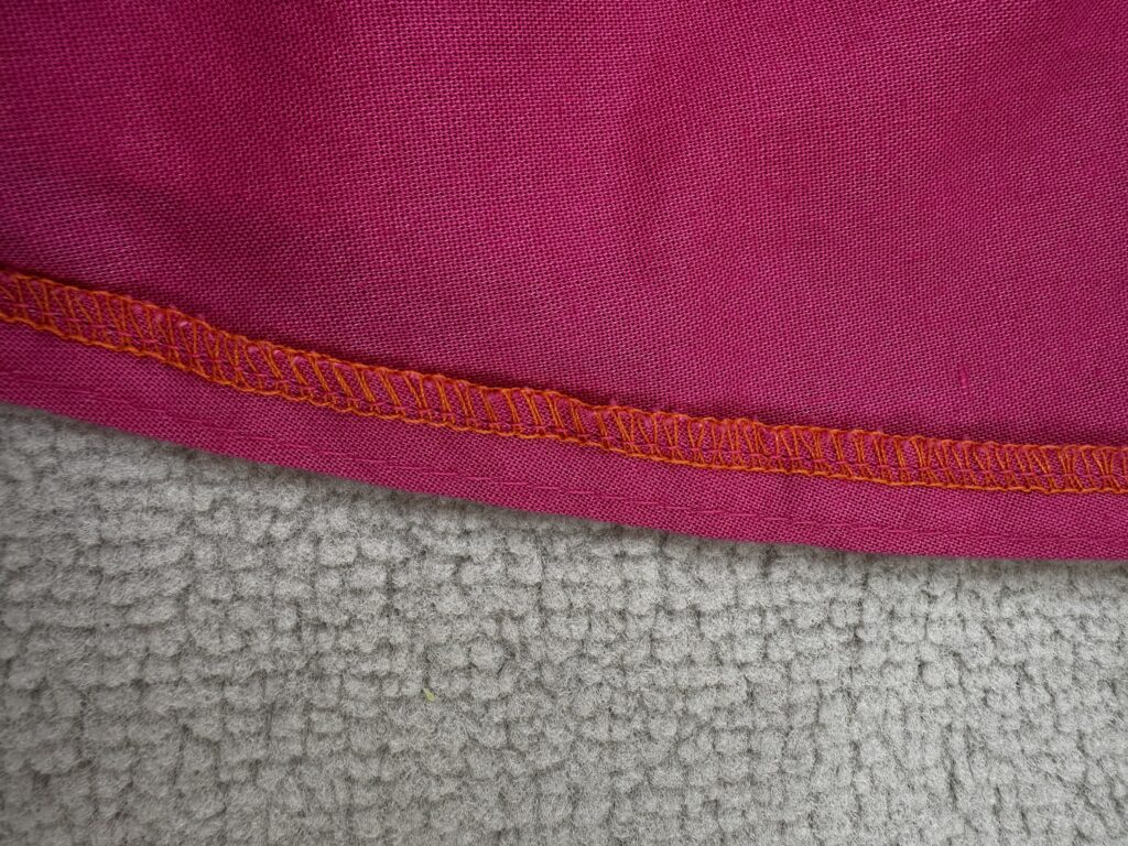 Podłożyć spódnicę z koła nie jest łatwo. Sekret to wąska zakładka. Najpierw przeszywamy dość długi (4mm) ścieg ‘pomocniczy’, który potem ułatwi nam prasowanie brzegu. To jest dobry patent.
