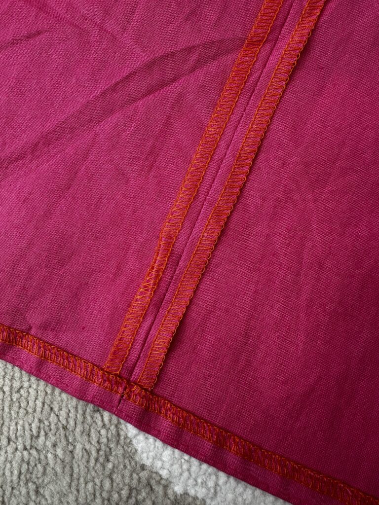 Wszystko obrzuciłam overlockiem na pomarańczowo, bo czemu nie? Spódnica z koła musi być wycyrklowana. Ten krok odpuściłam w satynowym modelu, ale tutaj postanowiłam to zrobić. Akurat trochę przypadkowo i niespodziewanie dla samej siebie kupiłam…. manekina krawieckiego: