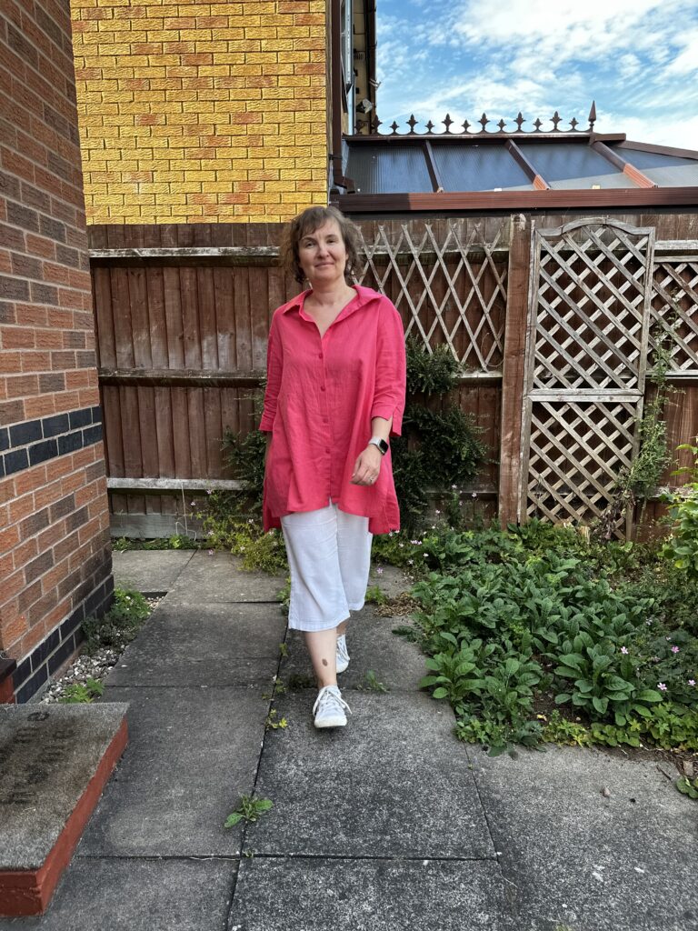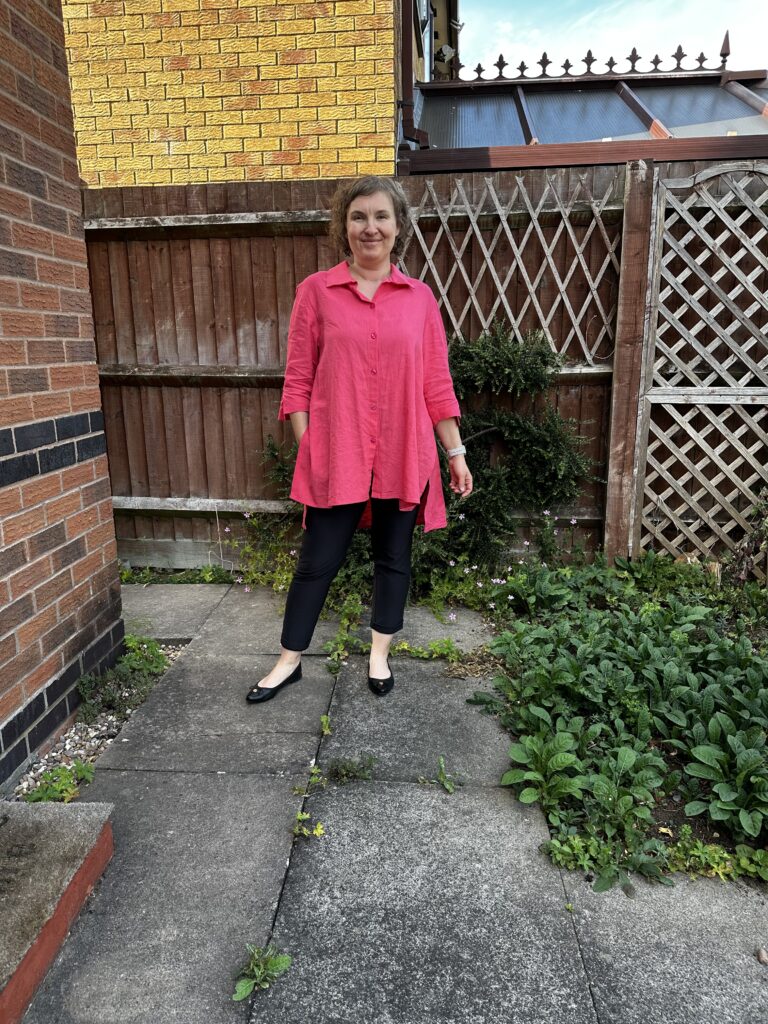Dzisiaj chcę Wam pokazać moją pinkową, lnianą koszulę. Wiąże się z nią moja największa (do tej pory) szyciowa wtopa. Dwa tygodnie temu w weekend usiadłam do dziurek. Poszło prawie idealnie, o czym poniżej. Zostało mi przyszycie guzików. Ponieważ jechaliśmy na miasto czy coś, to przygotowałam sobie front robót na czas kiedy wrócimy. Do małego woreczka z organzy włożyłam potrzebne rzeczy: dłuto i podkładkę do otwierania dziurek, igłę, nitkę, nawlekacz, guziki, nożyczki oraz fray check.