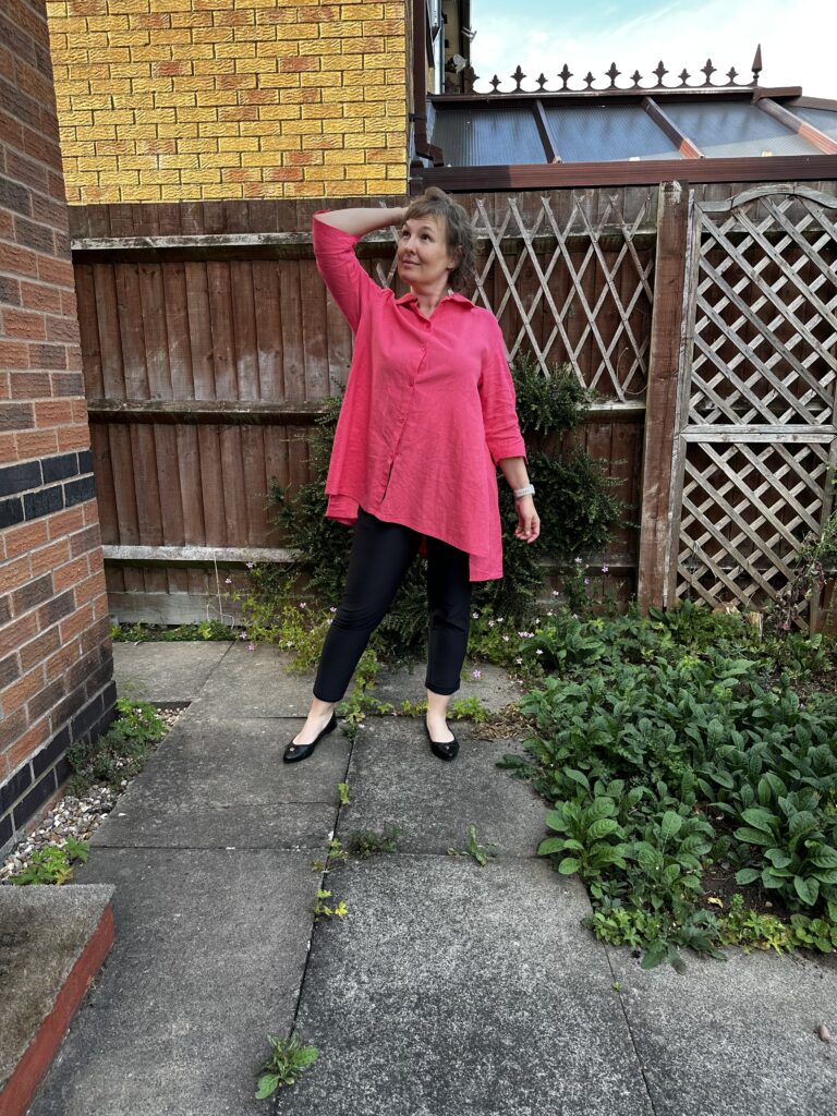 Krojenie tego cuda nie było łatwe, ale przyznam, że potem szyło się już jak po sznurku. Materiał to len 100%, który kupiłam tutaj (klik). Ma śliczny kolor (który z czasem niewątpliwie się spierze), taki fuksjowy róż ale ciepły. Muszę przyznać, że ten len był naprawdę łatwy w obróbce, siepił się tylko trochę i byłam naprawdę mile zaskoczona jego jakością.