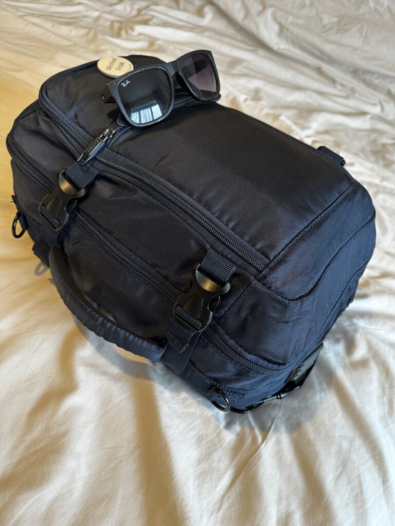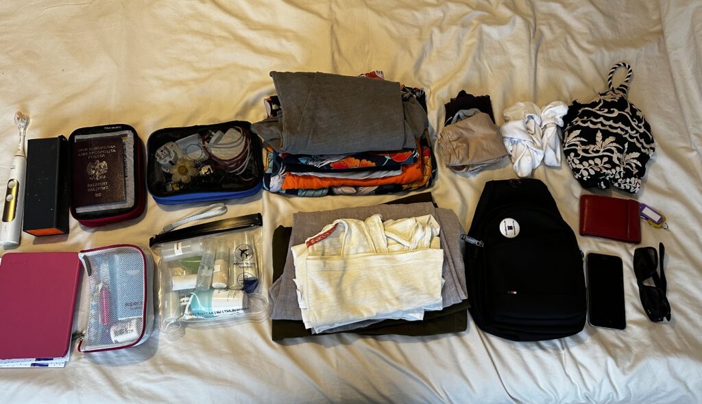 od prawej: skarpetki i majtki, kostium kąpielowy, portfel, klucze od domu (rodzinnego), okulary przeciwsłoneczne, polska komórka (plus angielska komórka, którą robię zdjęcie), mała torebka, piżama, zestaw do chodzenia po domu, koszulka z długim rękawem, dodatkowa para spodni, letnia sukienka, dwie koszulki, kosmetyczka z kosmetykami (przezroczysta i zgodna z wymogami security), kosmetyczka z kablami (ładowarki, przelotka, power bank), kosmetyczka z lekami i środkami higienicznymi, saszetka z dokumentami, okulary, szczoteczka do zębów i Kindle. Miałam też butelkę z wodą w bocznej kieszeni.