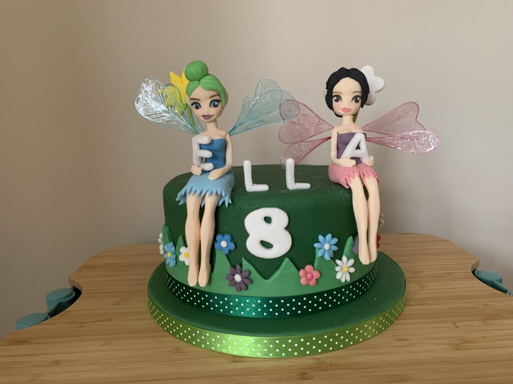 Tak, skrzydełka też sama zrobiłam 🙂 aczkolwiek złamałam moją zasadę, że wszystko ma być jadalne, bo są zrobione z drutu (i żelatyny). Ten tort nie należy do moich najbardziej udanych ale musiałam go zrobić pomiędzy podróżami do Reading gdzie zeznawałam jako świadek w sądzie pracy (napiszę o tym osobny wpis).