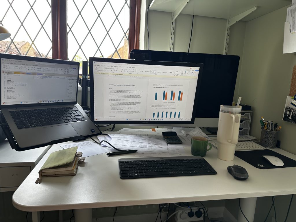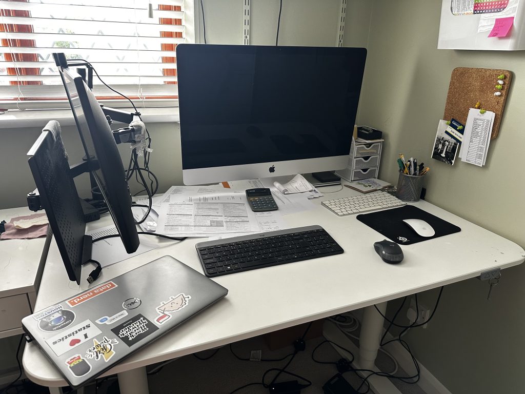Kiedy zaczęłam nową pracę dostałam służbowego laptopa oraz monitor. W buduarze na biurku miałam już dużego iMaca 27 cali, więc wstawienie tam kolejnego monitora było nie lada wyzwaniem. Przez ponad dwa lata moje biurko do pracy wyglądało tak: