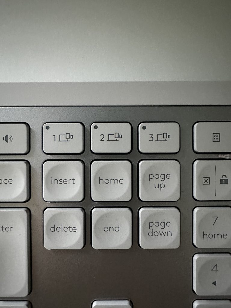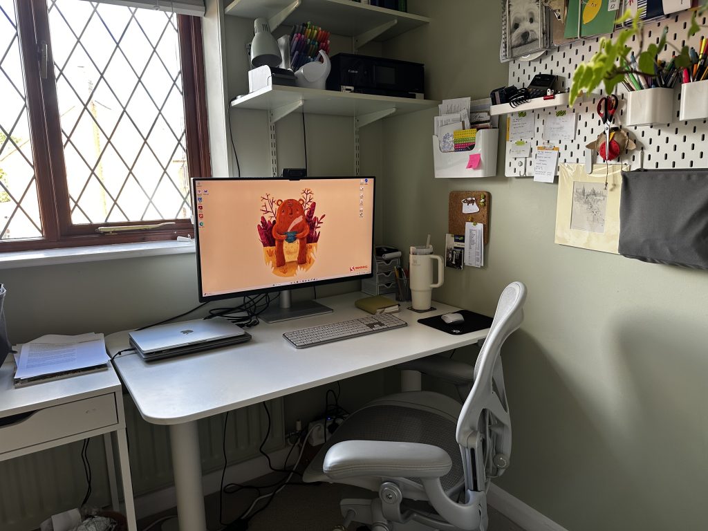 Służbowy monitor, stelaż, klawiatura z myszką i stacja dokująca powędrowały do garażu. Centralne miejsce zajął nowy, 32 calowy monitor. Pojawiły się też nowa klawiatura i myszka. Długo szukałam odpowiednich modeli. Oba współpracują zarówno z laptopem Apple jak i służbowym Dellem z Windowsem. Myszka ma pod spodem przycisk to przełączania między komputerami, podobnie klawiatura. Dodatkowo klawiatura ma oznaczenia dla Windowsa i Maca.