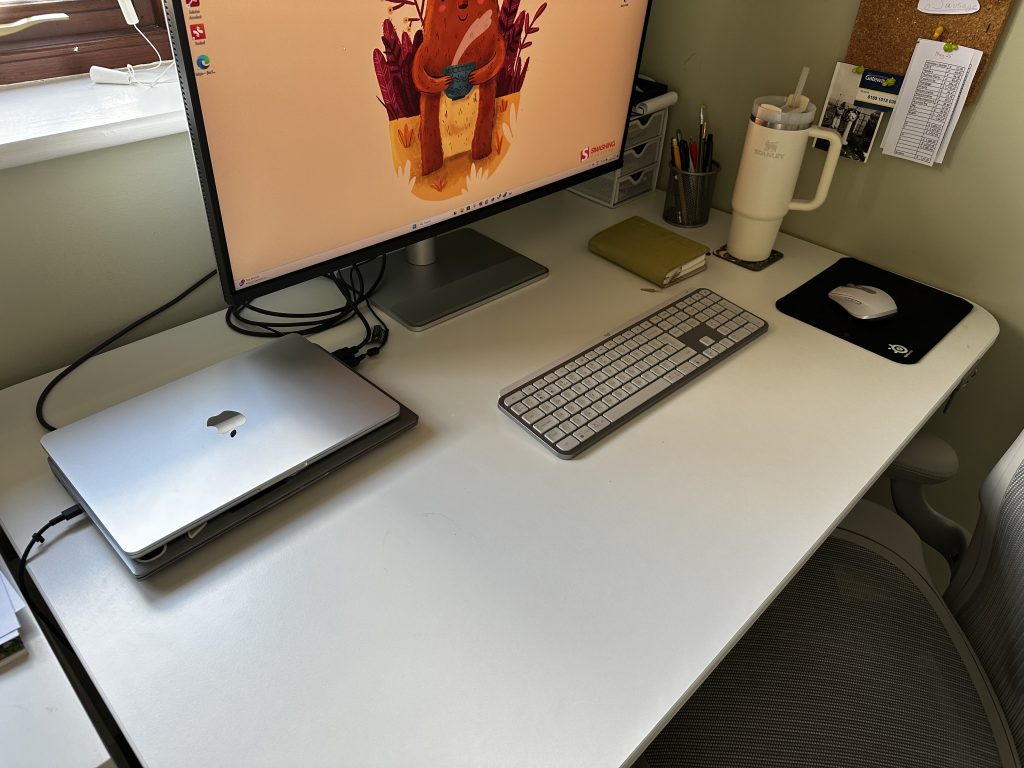 Mój nowy monitor jakościowo jest duuuuuużo, duuuuuużo lepszy niż mój służbowy monitor. Ponieważ jest ogromny, nie muszę już korzystać z dodatkowego ekranu na służbowym laptopie. Przyznaję, nie jest to jakość monitora iMac (cena była za to adekwatna) ale różnica jest akceptowalna. Nowego monitora i klawiatury używam głównie do pracy, ale jeśli najdzie mnie ochota podpinam nowego laptopa i mam prawie iMaca. Od czasu do czasu korzystam jeszcze z programów graficznych, więc taka opcja jest bardzo przydatna.