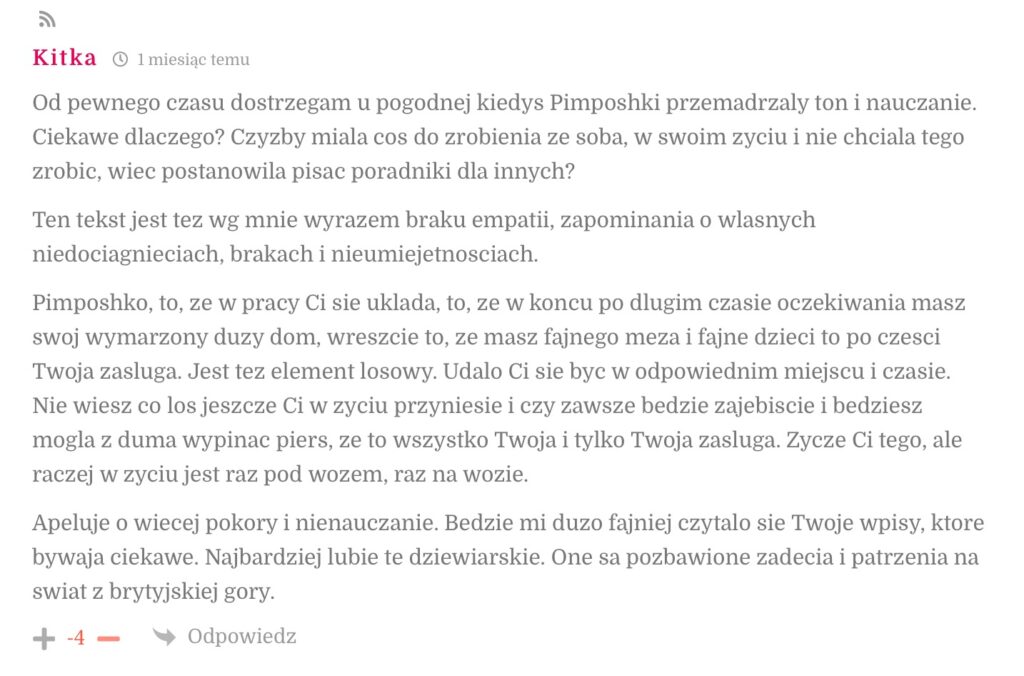 Sieć pełna jest ludzi niespełnionych, oceniających, z poczuciem misji, żeby każdemu powiedzieć “coś szczerego”, ale tak żeby mu w pięty poszło. Padłaś ofiarą takiej właśnie osoby, który pod pozorem opiniowania sączy jad. Zwykły troll napisze coś paskudnego i tyle. Doprawdy, nie wiem co gorsze.