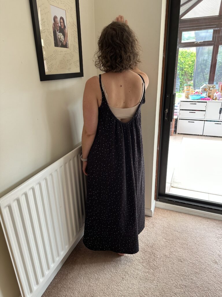 Sukienka ewidentnie jest uszyta z muślinu i jest prawdopodobnie bardzo prosta, bo w opisie nie znalazłam żadnych detali na temat ewentualnego wbudowanego biustonosza. Jak myślicie, ile ta sukienka kosztuje? 50 funtów? 100 funtów? 150 funtów? Otóż ta sukienka kosztuje….. 185 funtów!!!!! No dobra, kosztowała, kiedy szyłam swoją wersję, bo teraz jest na wyprzedaży za jedyne 120 funtów (klik). Moja wersja kosztowała około 20 funtów i w dodatku ma kieszenie! Konstrukcja tej sukienki jest tak prosta, że spokojnie sama wymierzyłam co i jak i uszyłam bez żadnych instrukcji.