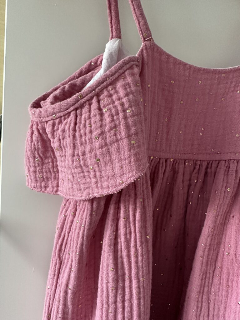 Muszę za to przyznać, że raczej nie kupię już muślinu w złote kropki. Te kropki nie lubią się z żelazkiem i chociaż skończony wyrób można prasować na lewej stronie, to w procesie szycia jest to dość upierdliwe. Są muśliny gładkie, we wzory oraz haftowane (z ‘dziurami’ i bez) więc wybór jest naprawdę spory.