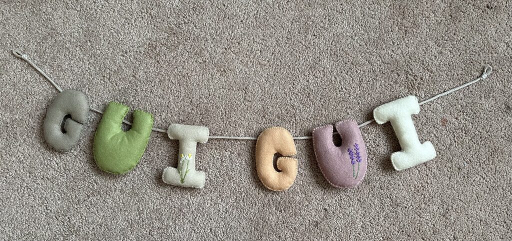 Udało mi się skończyć jeden projekt. Otóż jakiś czas temu (czyli w maju) koledze z pracy (jeszcze tej starej) urodziła się córka. Córka ma dwa imiona: Guiomar Gwawr. Wprawne oko lingwisty, tudzież poligloty wyłapie, że rzeczone dziecię jest produktem portugalsko-walijskim. Na szczęście rodzice mówią do niej Gui Gui. 🙂 Zrobiłam jej w prezencie zawieszkę na ścianę: