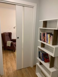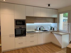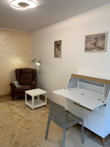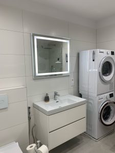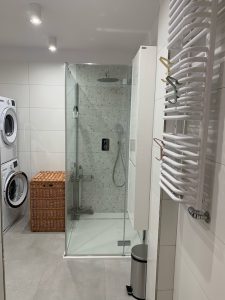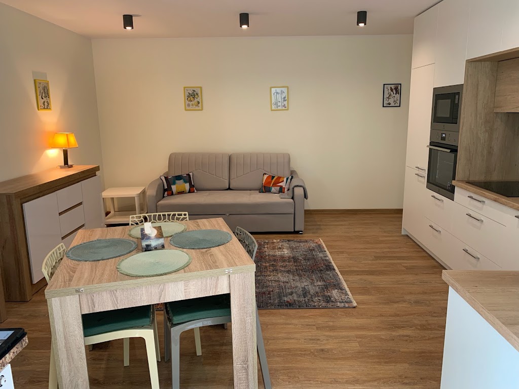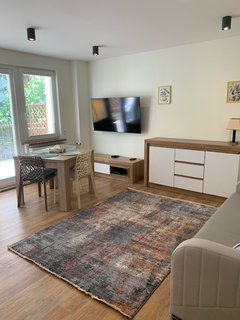 Apartament w budynku z końca lat osiemdziesiątych (wysoki parter) przeszedł gruntowny, generalny remont z wymianą wszystkich instalacji i jest wykończony w wysokim standardzie. Salon ma aneks kuchenny i wyjście na taras przed podwójne drzwi balkonowe. Kuchnia jest w pełni wyposażona w nowoczesny sprzęt AGD: płyta indukcyjna ze zintegrowanym okapem, piekarnik elektryczny, zmywarka, duża lodówko-zamrażarka i wbudowana kuchenka mikrofalowa. Do tego na wyposażeniu jest ekspres do kawy (kapsułki Nespresso lub kompatybilne), czajnik elektryczny oraz garnki, sztućce, zastawa, szkło… W salonie znajduje się podwójna, rozkładana kanapa, stół, komoda. Telewizor na ramieniu regulowanym z telewizją internetową (61 kanałow). W mieszkaniu jest szybki Internet 2.4 GHz i 5GHz. Na tarasie jest dodatkowy stolik i krzesła.