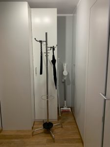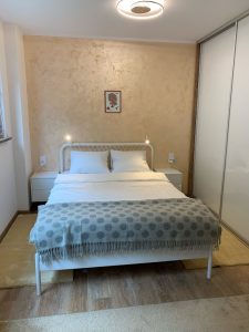 Sypialnia jest bardzo przestronna, znajduje się z niej podwójne łóżko, sekretarzyk, fotel i duża szafa wnękowa. W przedpokoju obok szafy gospodarczej odkurzacz w stacji dokującej, deska do prasowania z żelazkiem oraz przybory do sprzątania. W łazience na wyposażeniu pralka automatyczna i suszarka automatyczna w kolumnie.