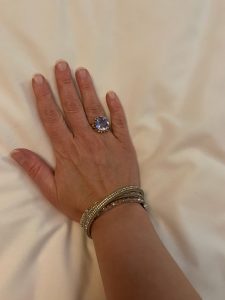 We włosy wpięłam sztuczne kwiaty, które miałam na moim ślubie. Założyłam też duży pierścionek z akwamarynem, który należał do mojej Babci a teraz należy od mnie (Babcia jeszcze żyje). Do tego bransoletka od Tiffaniego, którą dostałam od teściów jak skończyłam doktorat i bransoletka od Sworovskiego, którą dostałam od Pana Kapitana. Bardzo lubię ten zestaw.