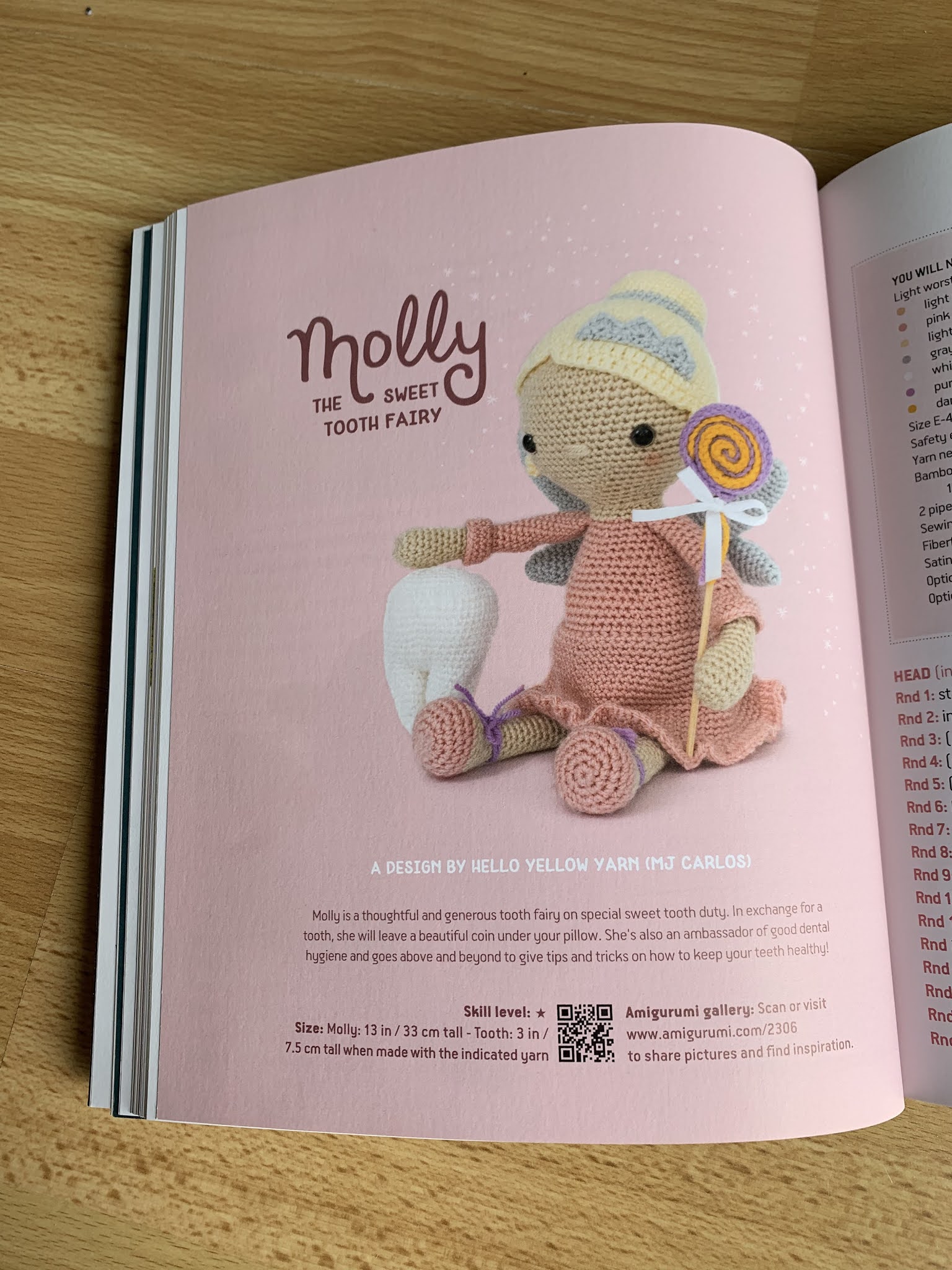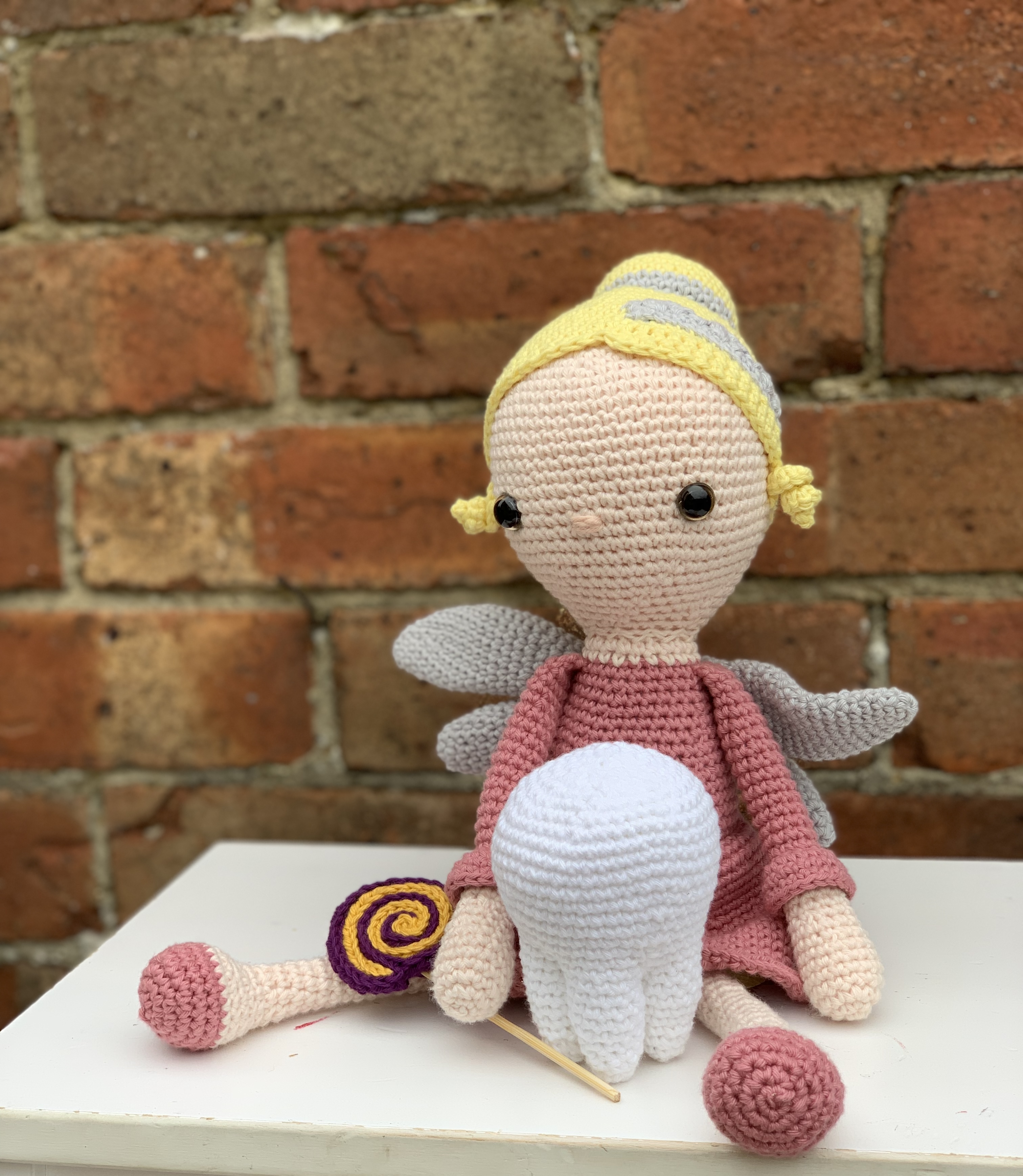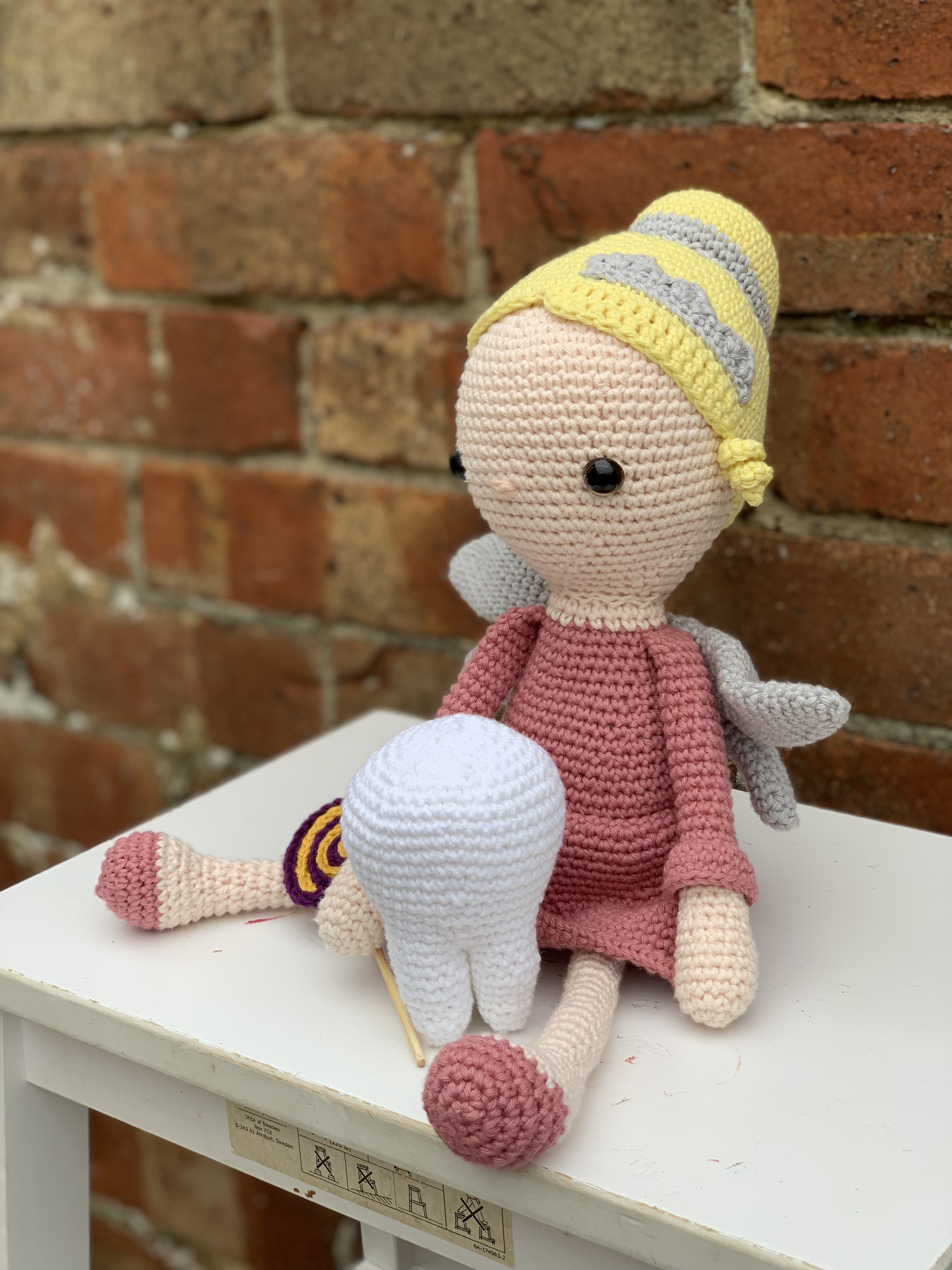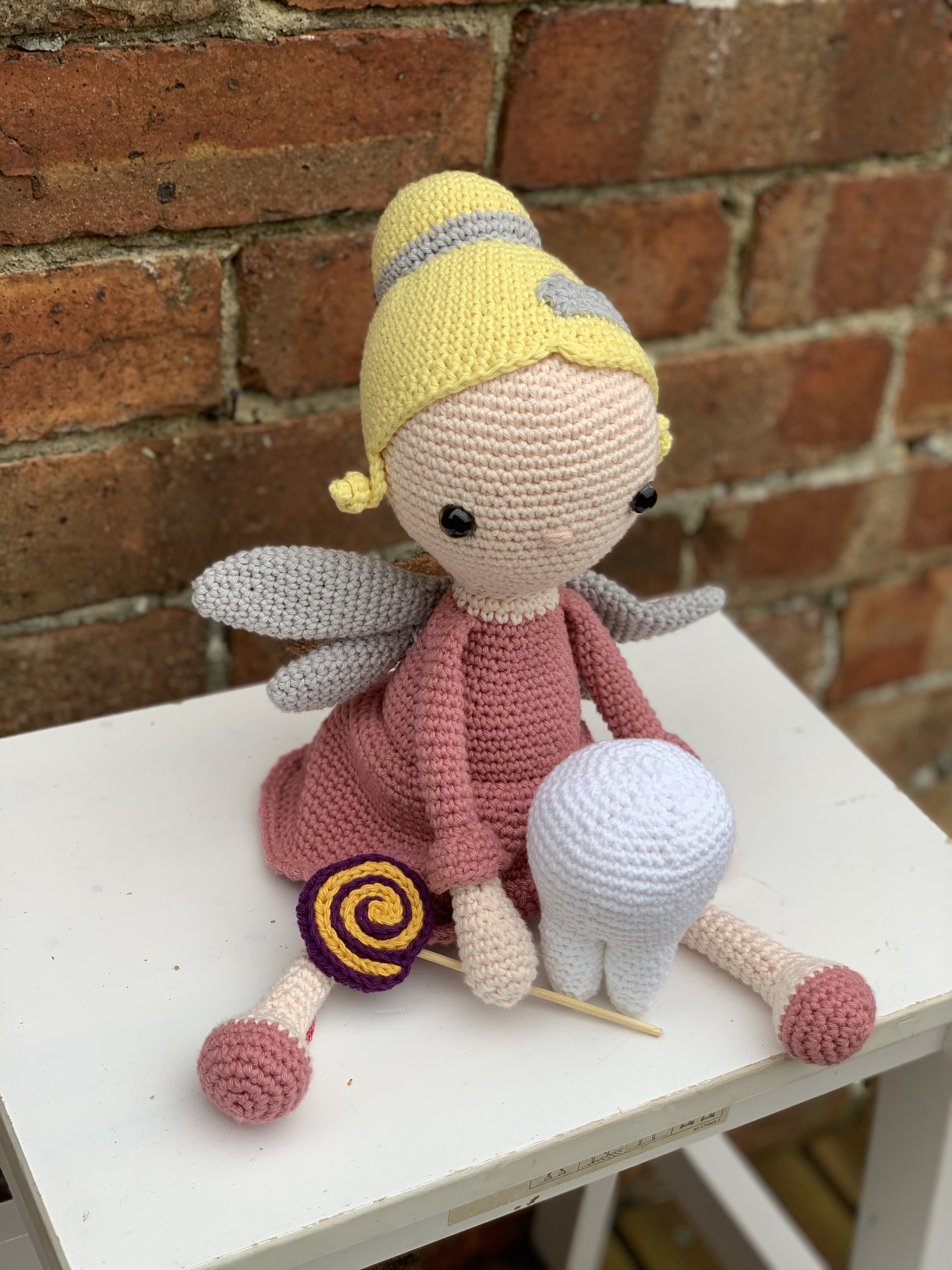 Rekonwalescencja z pewnością przyczyniła się do rozwinięcia moich zdolności szydełkowych. Wróżka zębuszka to chyba moja ulubiona tradycja ‘zachodnia’, która przyjęła się też w Polsce (Walentynki i Halołiny mnie tak nie kręcą). Postanowiłam więc zrobić dziewczynom wróżkę, która zamieszka u nich w pokoju i zajmie się administracją wypadających mleczaków. Wzór pochodzi z tej książki:
