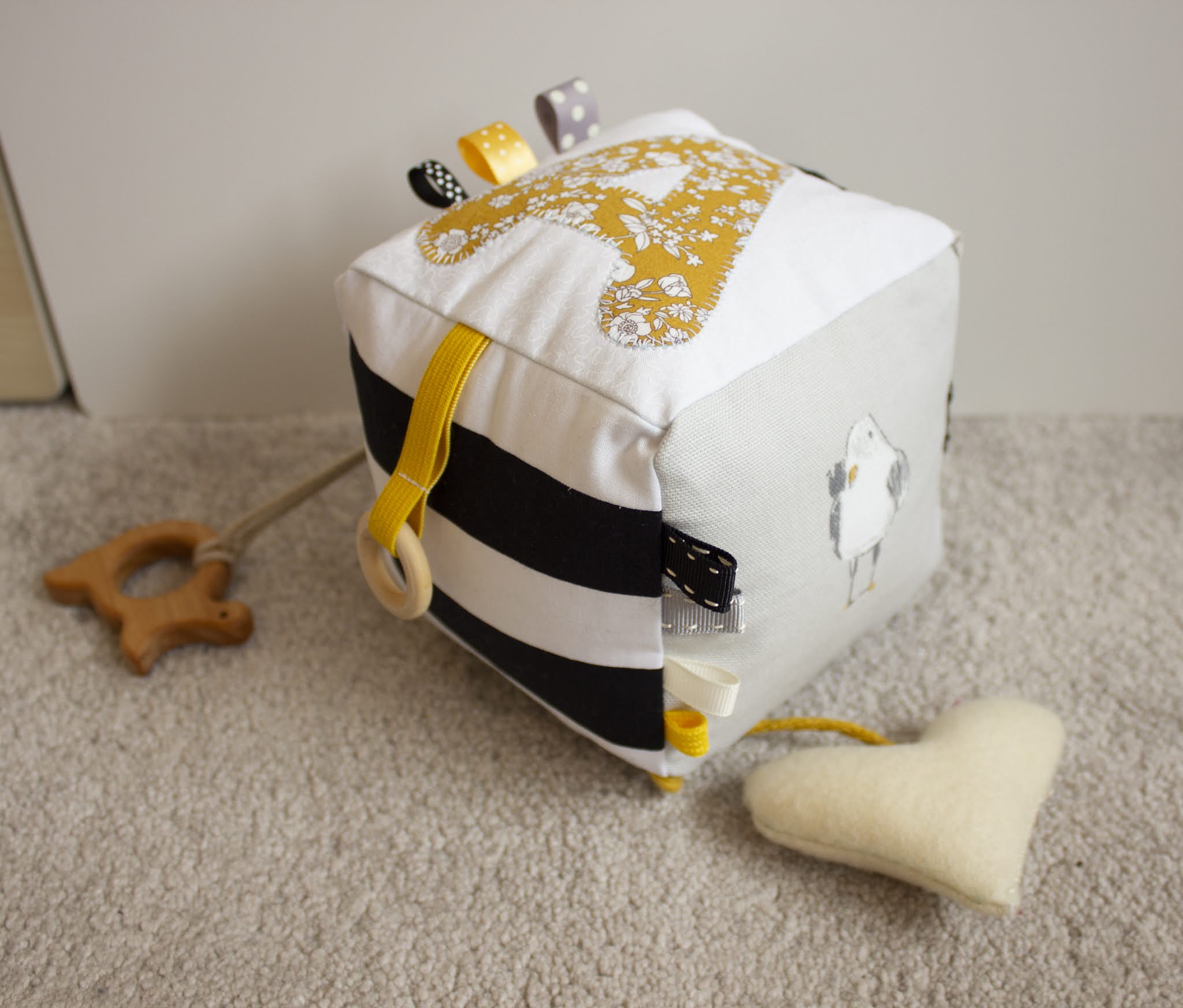 Ta kostka jest nieco bardziej dziewczęca, choć zrobiona z podobnych materiałków jak kostka numer 1 (klik). Tym razem wkomponowałam bawełnę Tana Lawn z Liberty. Mama Amelii była zachwycona prezentem. To bardzo bogata rodzina, związana z Formułą 1 ale takiej kostki nie można nigdzie kupić ;). Tak jak pisałam w planach jest jeszcze jedna kostka dla mojego szefa (tzn. jego córki, która ma się urodzić w połowie sierpnia) a ponieważ on planuje miesięczny urlop tacierzyński to przy odrobinie dobrej organizacji kostkę numer 3 będę już szyć w moim buduarze w nowym domu.