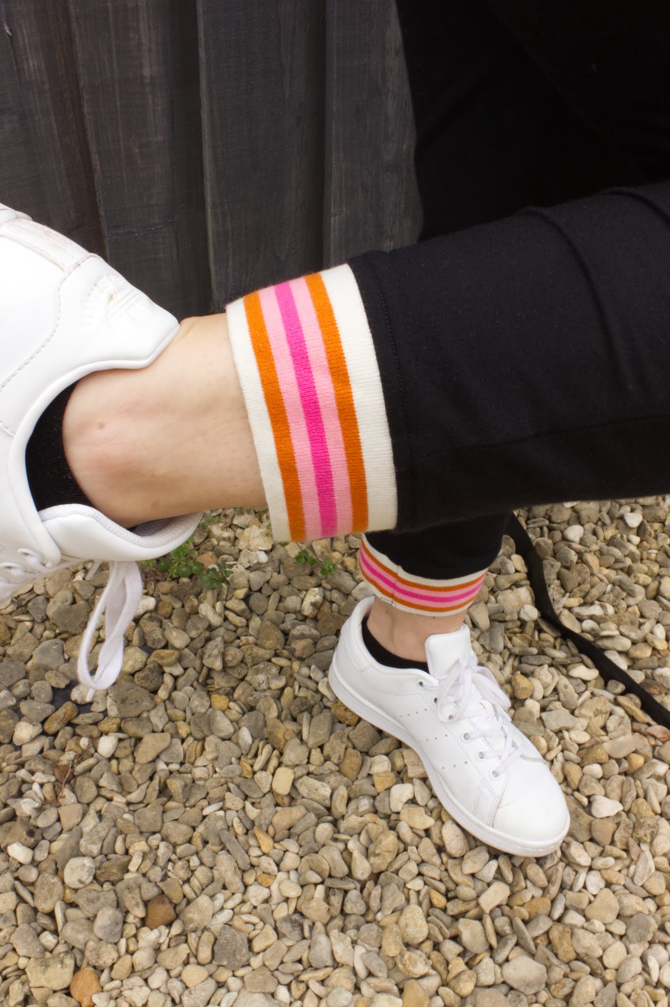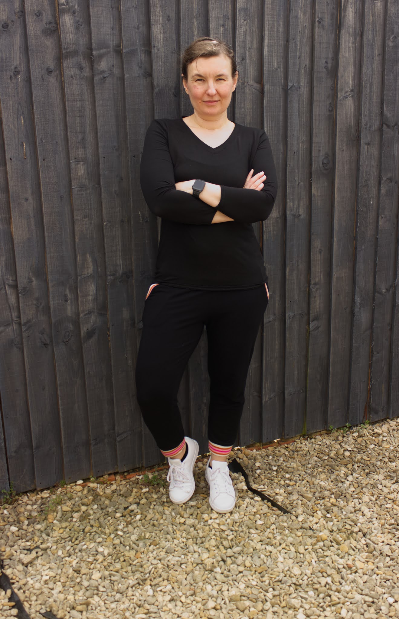 Druga para spodni jest niemal identyczna ale bez kolorowego ściągacza, ma tylko podwinięty mankiet. Obie pary miały w założeniu być ‘kąsaczami kostek’ (z ang. ankle grazer) czyli 7/8. Te są bardziej ‘wyjściowe’ bo całe czarne aby pasowały do wszystkiego. Są uszyte z innej dresówki modalnej. W dotyku materiał jest taki sam. Różnica jest taka, że spodnie numer jeden są uszyte z materiału w cenie 11 funtów za metr a te drugie z materiału w cenie 24 funty za metr! Ciekawa jestem czy będzie jakaś różnica w użytkowaniu. Oby!