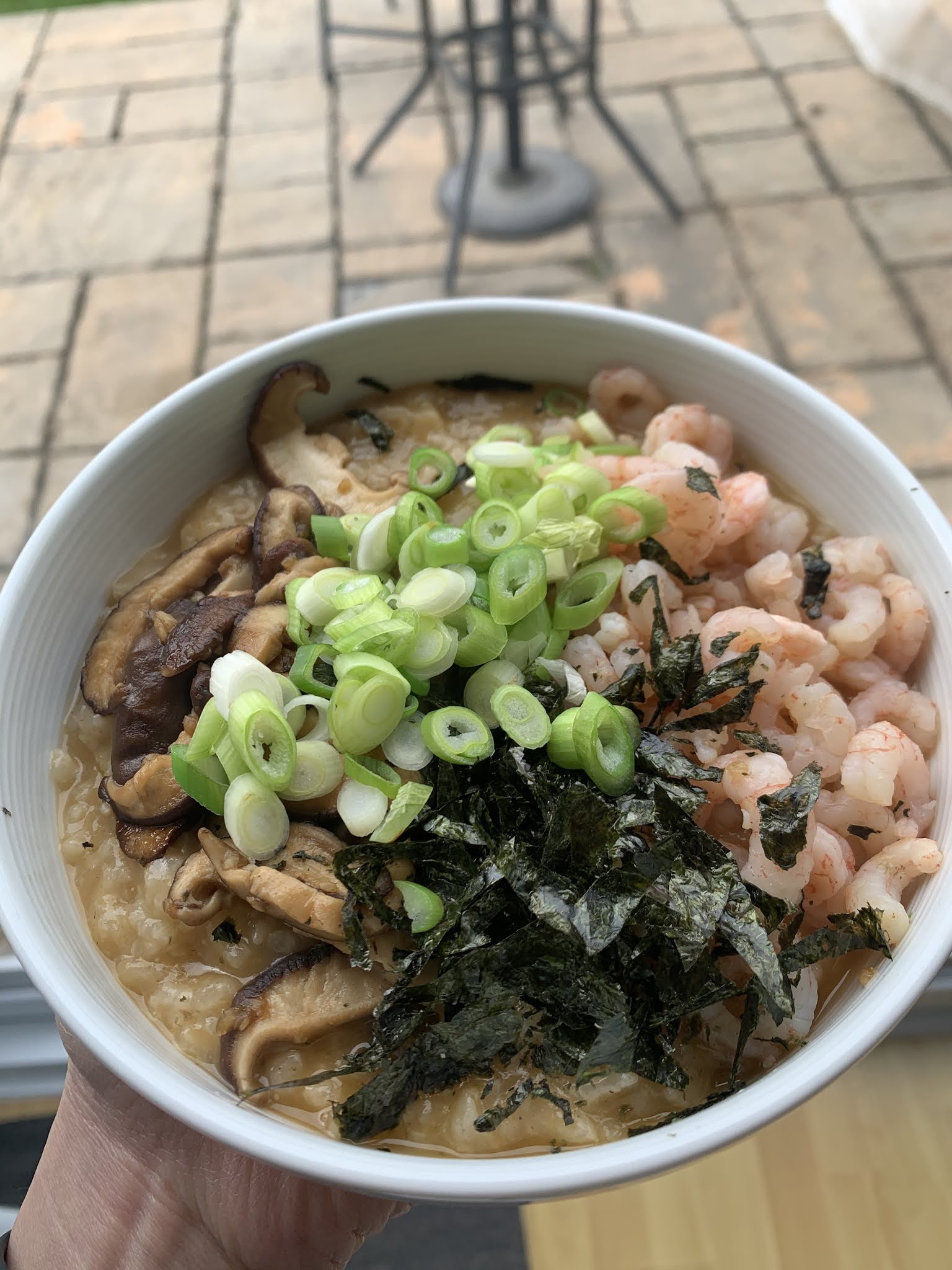 Po trzecie ryż można nastawić wieczorem i mamy idealny ryż na śniadanie. Ja ostatnio eksperymentuję z jedzeniem dużych, wytrwanych śniadań i ryż jest do tego idealny. Jednym z takich śniadań jest congee, ‘owsianka’ z ryżu czyli ryżanka. Co za wspaniały wynalazek. Już dawno chciałam jej spróbować ale jakoś nigdy nie zabrałam się do gotowania jej na gazie. Z ryżowaru wychodzi świetna. Generalnie do ryżowaru wkładamy pół miarki ryżu i 4.5 miarki bulionu. Rano mamy wytrawny ryżowy kleik. Można go jeść z dodatkami. W moim przypadku były to krewetki, grzyby shiitake, trochę wodorostów i cebula dymka: