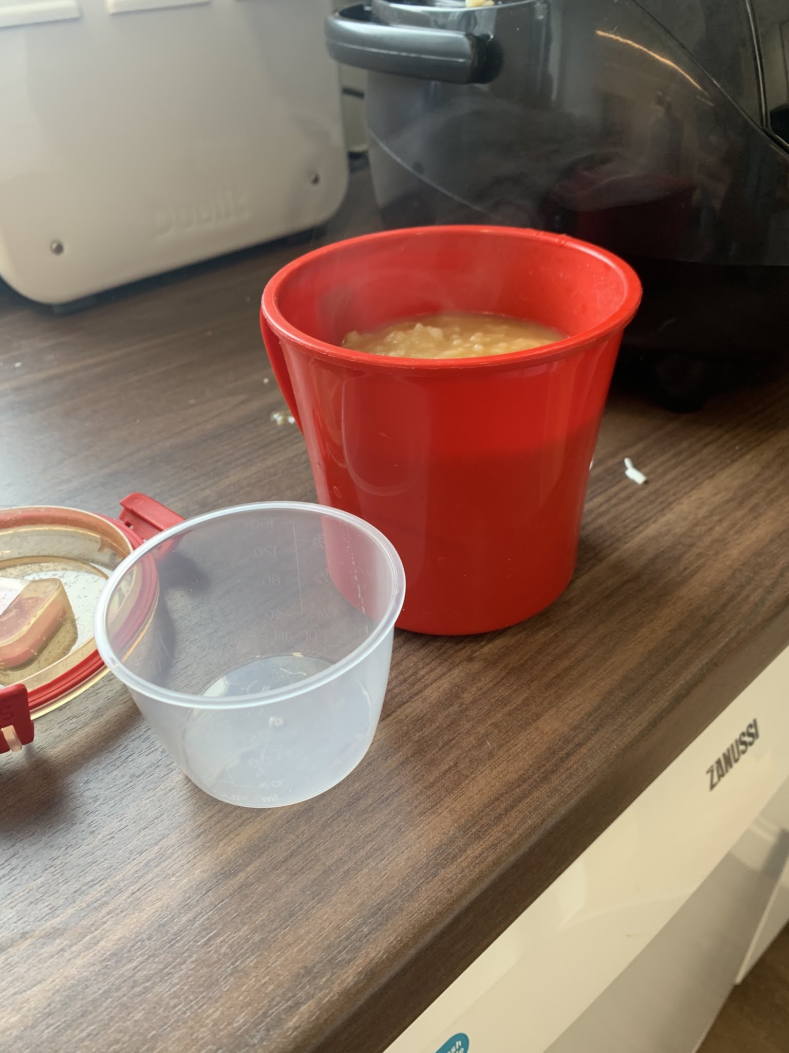 Na tym zdjęciu widzicie miarkę do ryżu a w kubku jest połowa porcji congee, która powstała z połowy tej miarki.