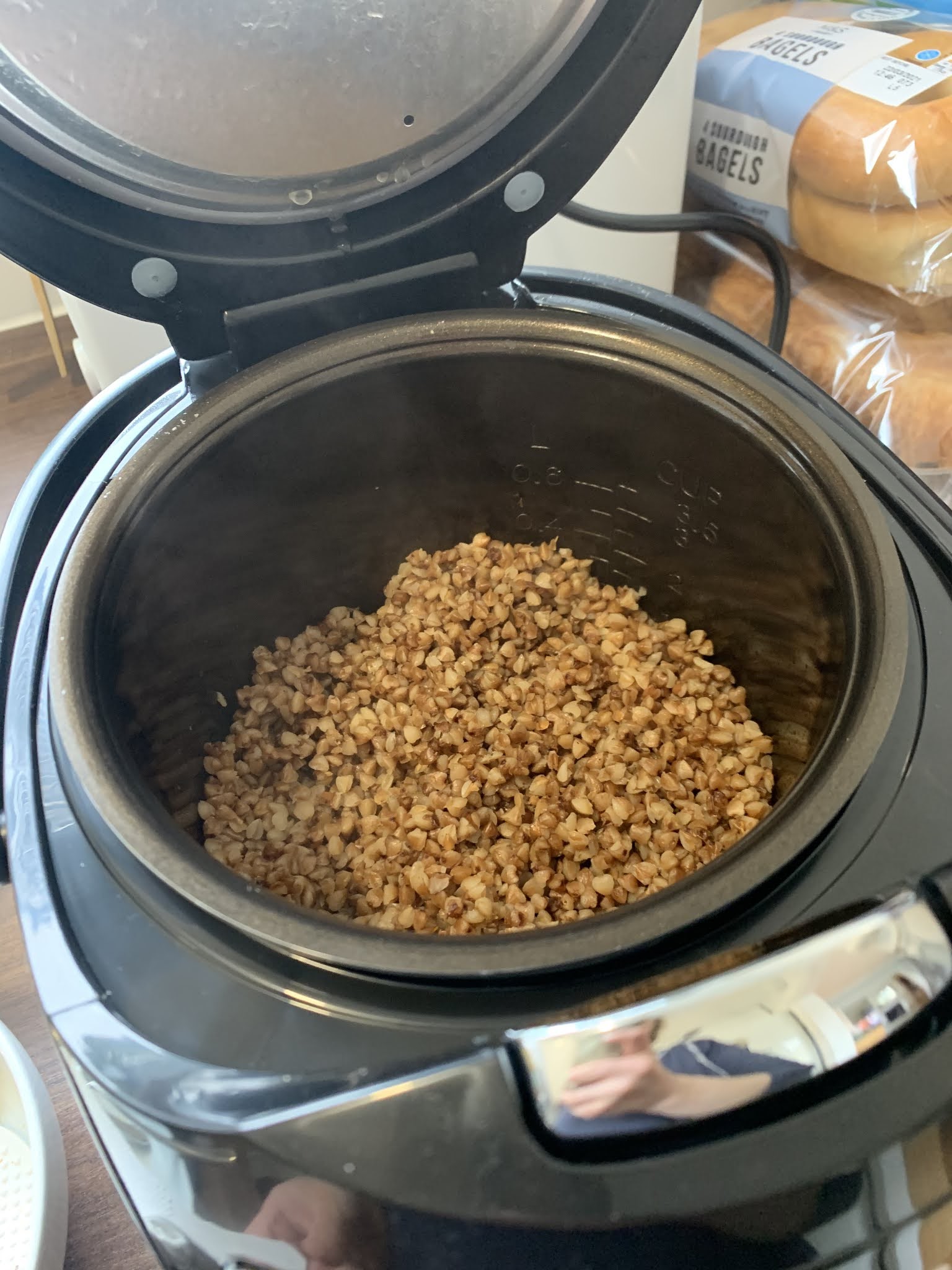 Jak już opanowałam gotowanie ryżu to zaczęłam się zastanawiać czy da się w ryżowarze uprażyć kaszę. Wpisałam w google ‘kasza w ryżowarze’ i znalazłam jakieś forum, na którym ktoś zadał to pytanie. Pod postem było jakieś 75 wpisów w tonie ‘po co ryżowar, ja kaszę gotuję tak…’ żaden komentarz nie odpowiedział na pytanie jak ugotować kaszę w ryżowarze ;). Napisałam do Jonki i odpisała, że oczywiście jak najbardziej. Wzięłam więc kaszę gryczaną z torebki (niemal cała miarka), dodałam dwie miarki wody, trochę masła, trochę pasty bulionowej i nastawiłam program ‘standard’. Kasza wyszła idealna!