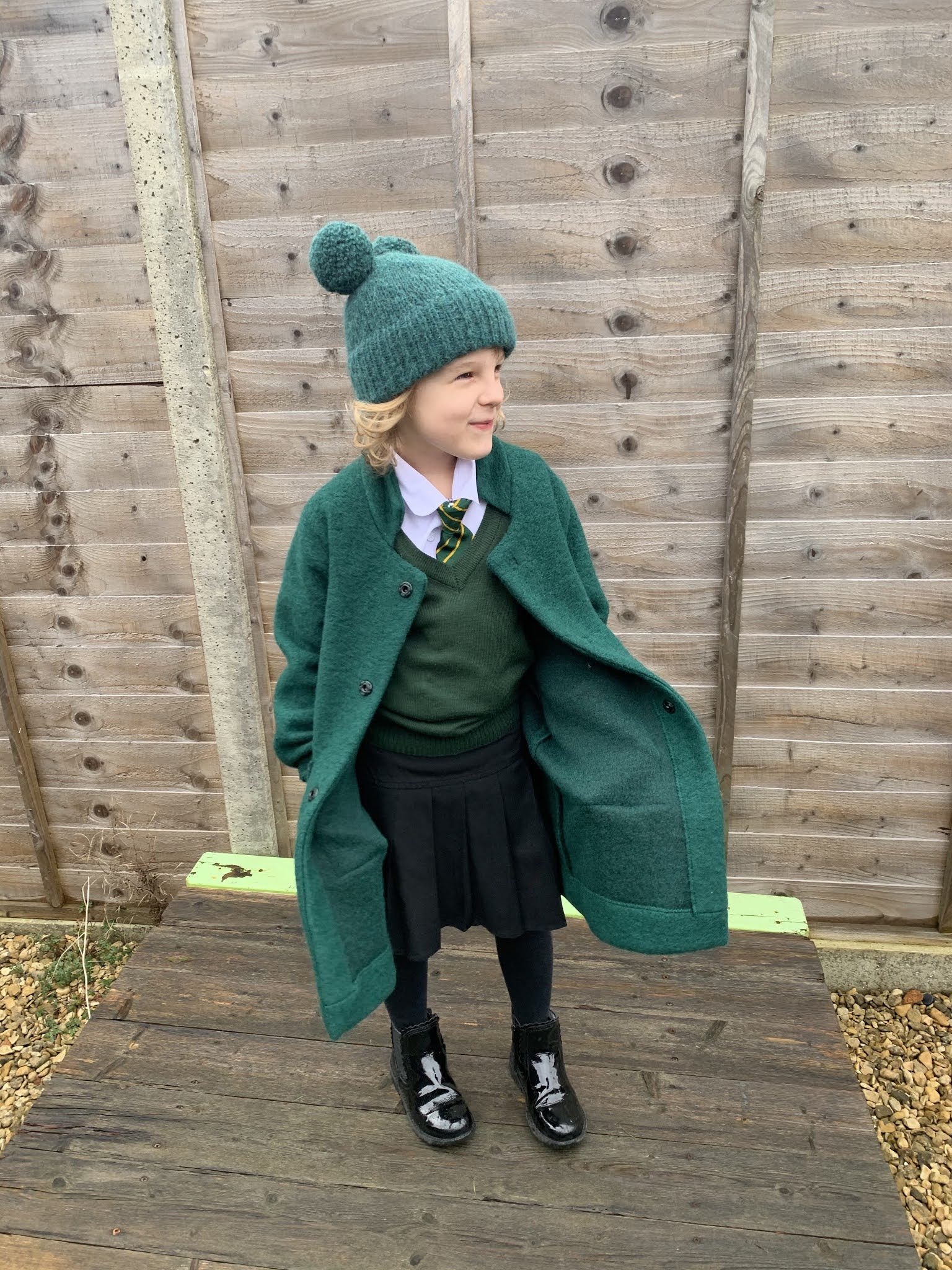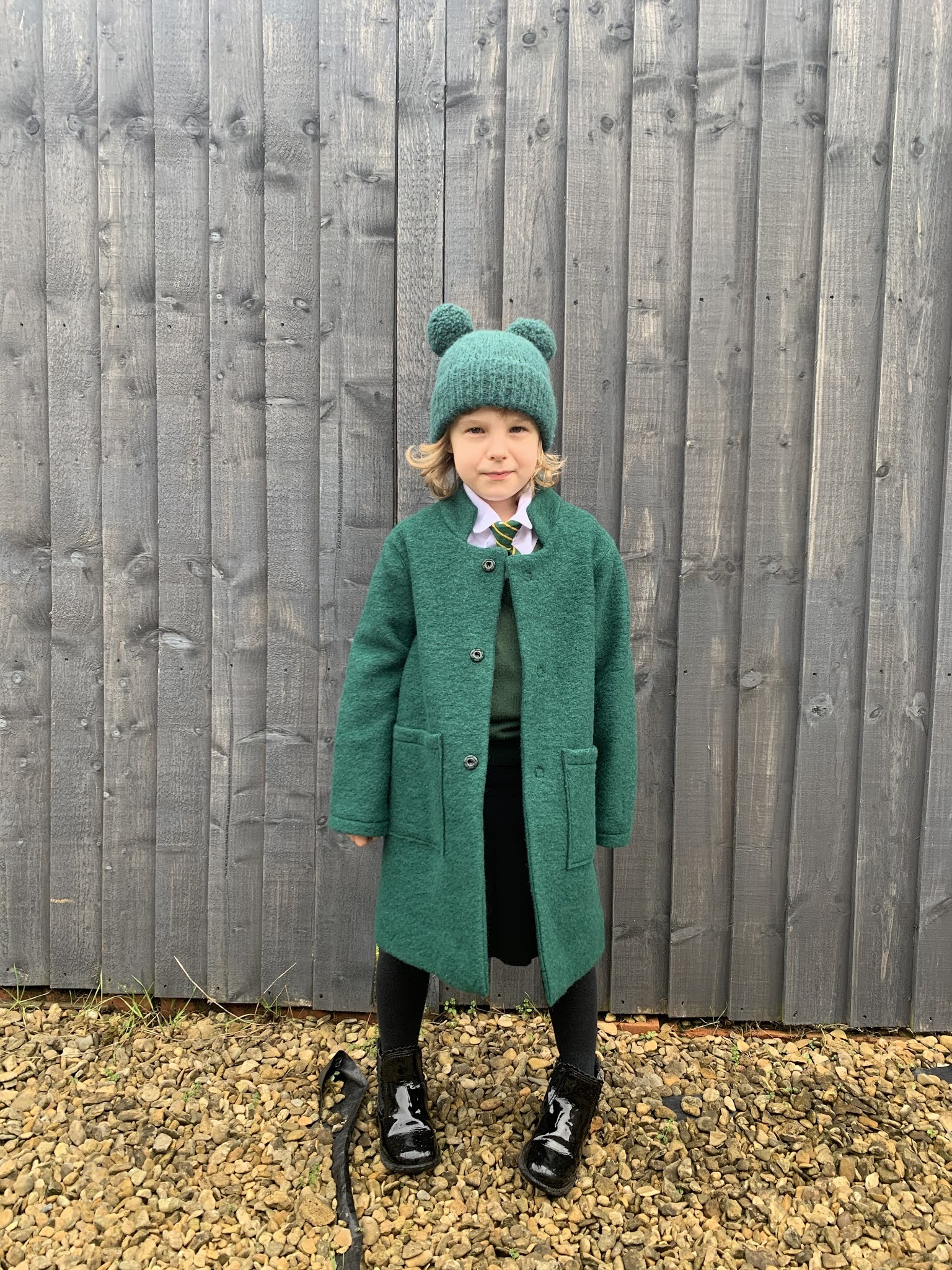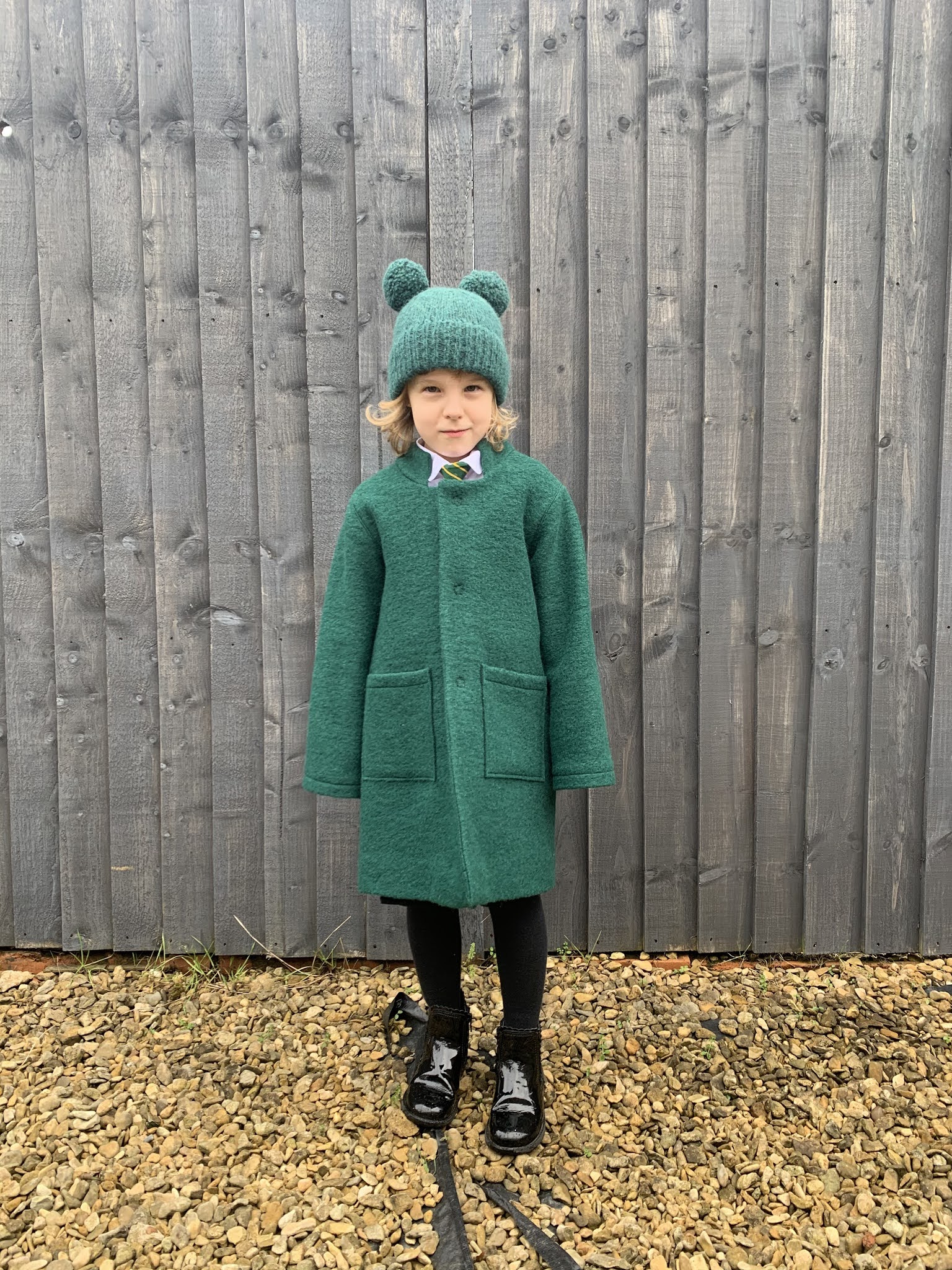 Dodatkowo kupiłam motek włóczki (Drops Air) idealnie pasujący do materiału na płaszczyk i wydziergałam starszej P. czapkę do kompletu. Tak prezentuje się całość, młoda nawet specjalnie ubrała się do zdjęć w szkolny mundurek: