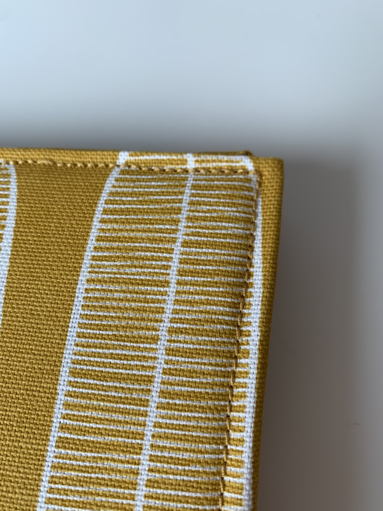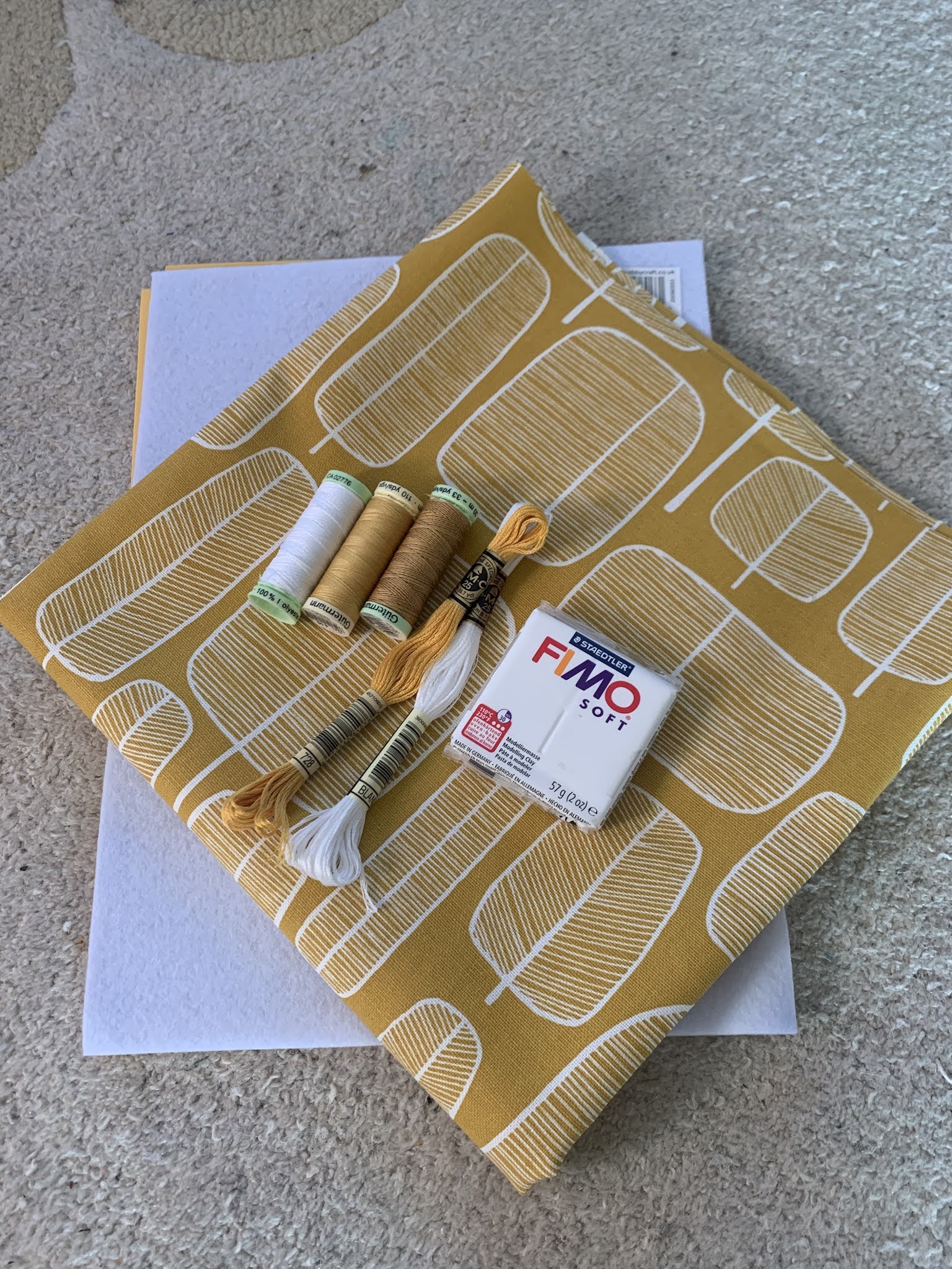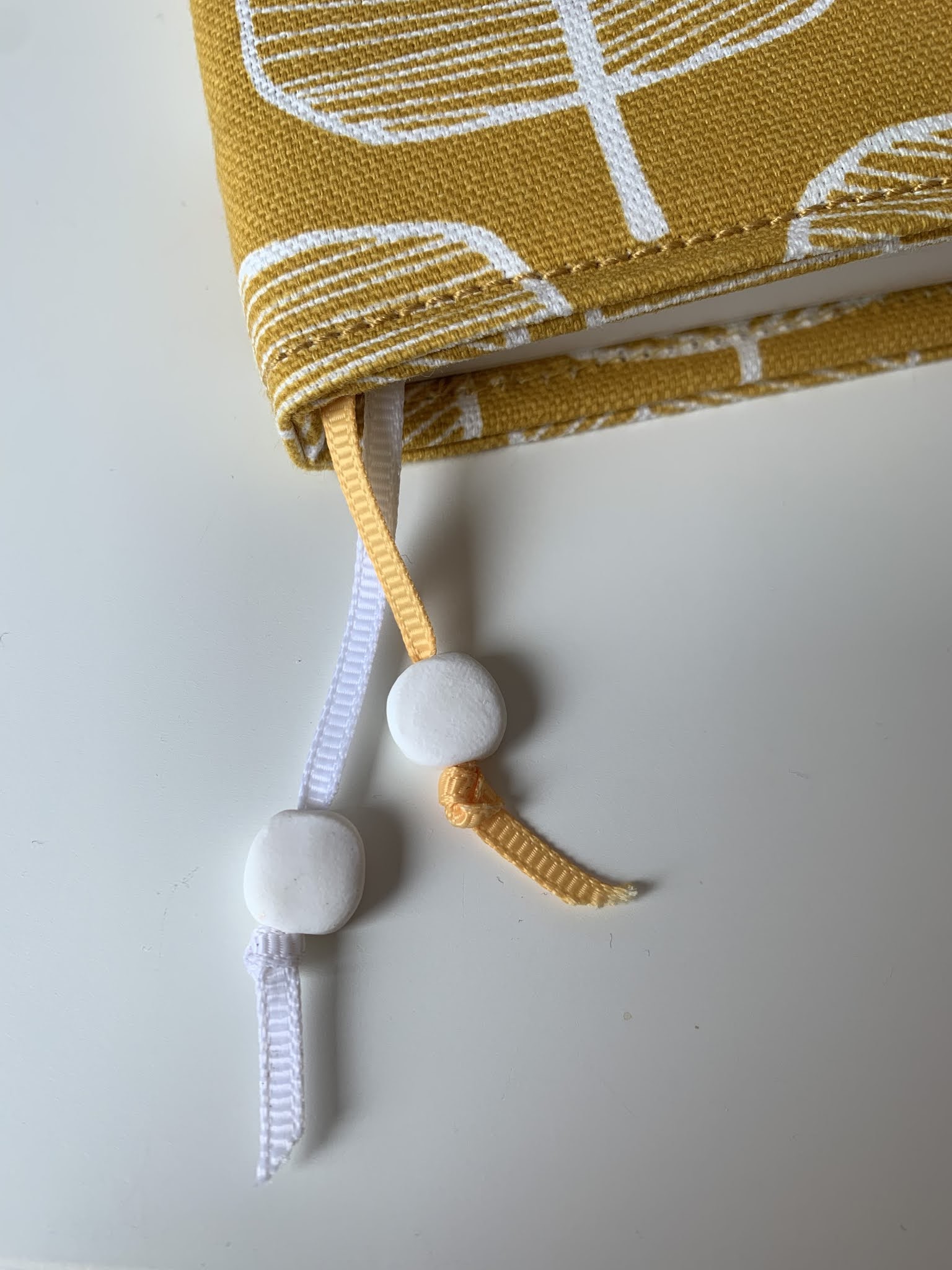 Jak jeszcze sklepy typu pasmanteria były otwarte zakupiłam stosowne materiały. Z muliny nawet zrobiłam tasiemki-krajki na zakładki ale finalnie kupiłam wstążkę podobną do tej, która jest w oryginalnej okładce. Za to ‘koraliki’ na końce zrobiłam sama z FIMO. Ta okładka to trzecie podejście. Chciałam ją koniecznie obszyć maszyną a w modelu numer dwa (model numer jeden wyszedł za duży) podkleiłam brzegi zwykłą dwustronną taśmą i niestety igła w maszynie cała się kleiła i nic z tego nie wyszło. Już bez lepkiej taśmy maszynie poszło całkiem spoko szczególnie, że mówimy o kartonie, filcu i kilku warstwach dość grubego materiału tapicerskiego. Do szycia użyłam grubszej nici do przeszyć i igły 100 do dżinsu – poszło zazwyczaj gładko. Jestem bardzo zadowolona z efektu, planer zrobił mi się lżejszy, mniejszy i poręczniejszy i o to mi chodziło (jest jakiś centymetr węższy i centymetr krótszy). Poza tym, teraz mogę zmieniać okładki jak rękawiczki :).