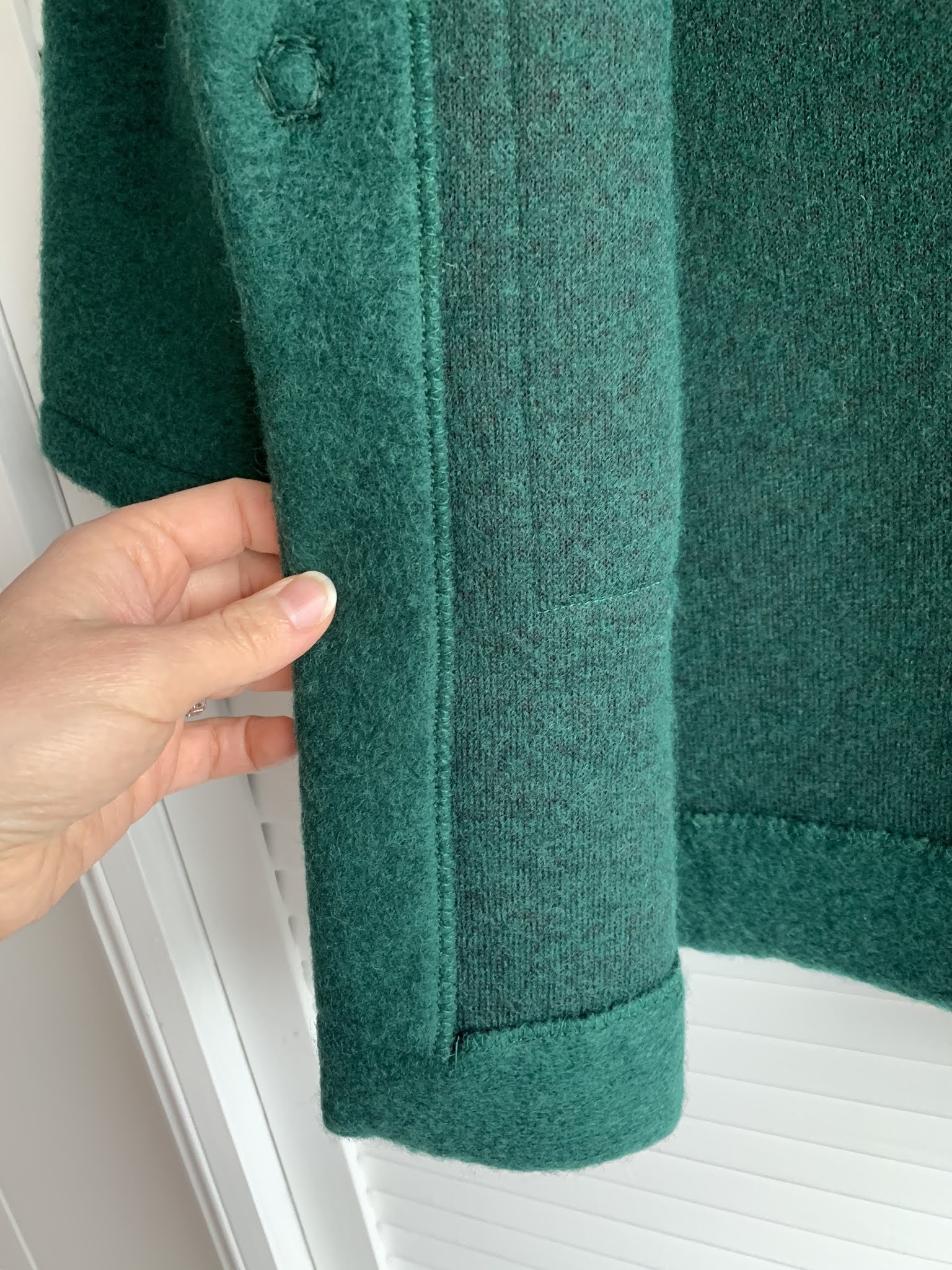 to nietrudno o błąd. Nie lubię wykrojów, gdzie trzeba samemu dodawać zapasy na szwy. Zawsze coś sknocę. Po drugie to źle wszyłam kołnierz a zorientowałam się dopiero jak już poobcinałam zapasy na szwy więc rozprucie i ponowne zszycie było dość kłopotliwe. Tym bardziej jestem zadowolona z końcowego efektu i że nic specjalnie nie odstaje. Jestem nawet gotowa przymknąć oko na to, że płaszczyk wyszedł ciut za duży ;).