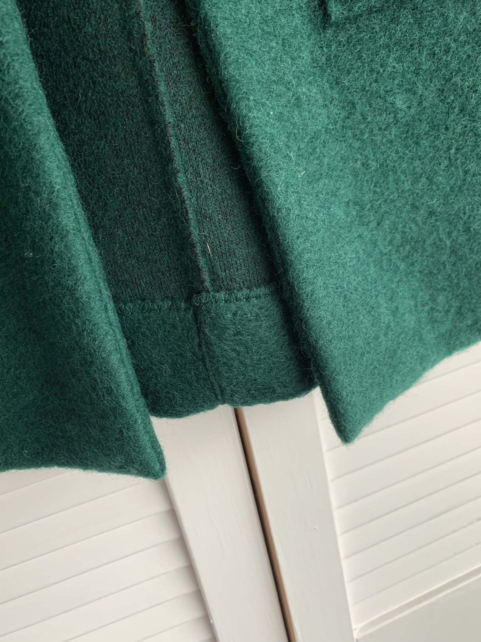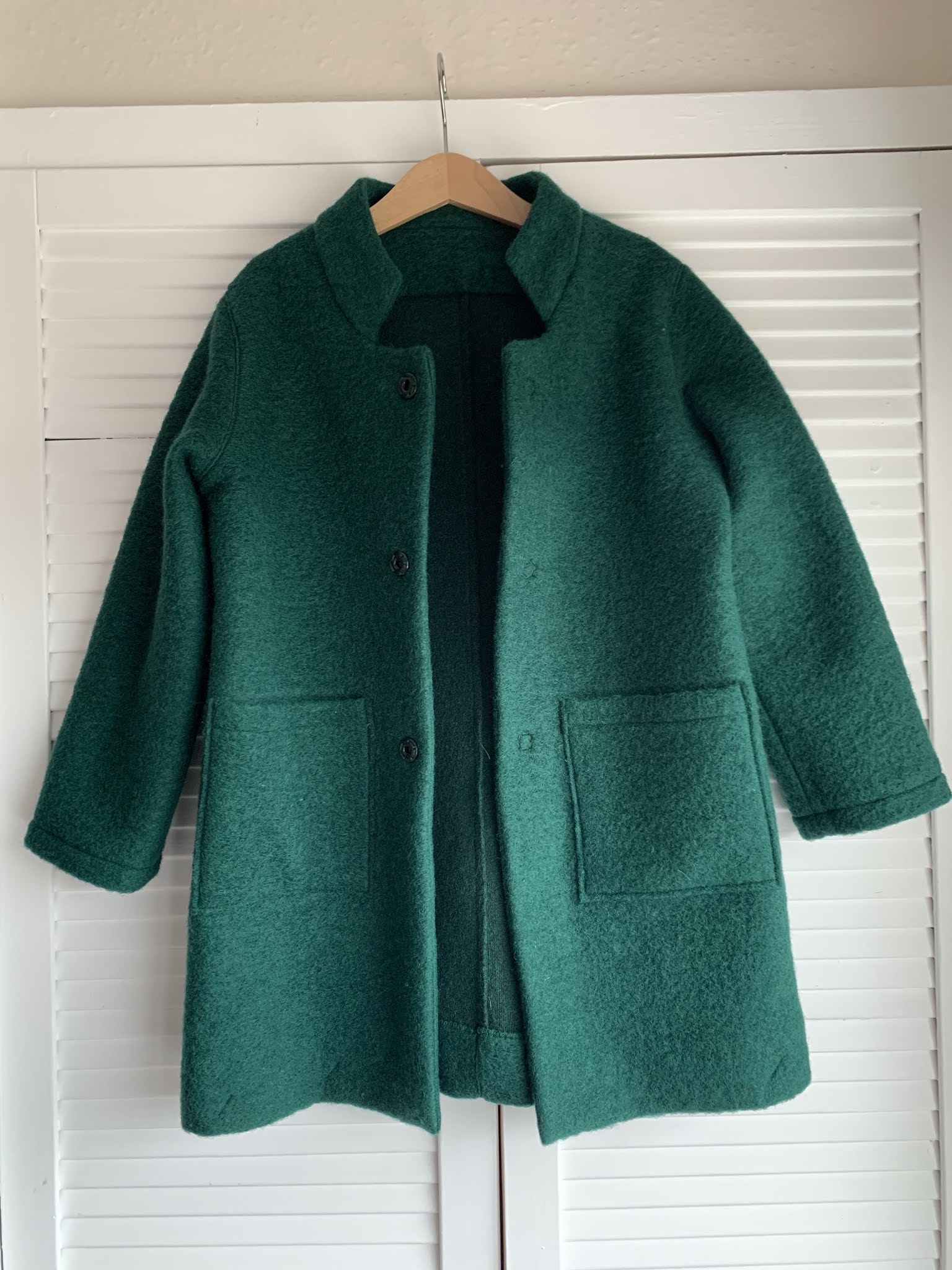 Po tych wszystkich dżersejach miałam ochotę uszyć coś trochę z innej bajki. Ponownie w myfabrics.co.uk (w Polsce ta strona jest znana jako tkaniny.net) kupiłam wełnę parzoną (70% wełny i 30% sztuczności) w ‘służbowym’ szkolnym kolorze z przeznaczeniem na płaszczyk dla starszej P. Wzór pochodzi z magazynu Ottobre, który poznałam dzięki czytelniczce bloga (dziękuję :). Płaszczyk szyło się bardzo przyjemnie, wełna parzona jest bardzo łatwa w obróbce. Zrobiłam jednak dwa duże błędy wszywając kołnierz i cieszę się, że w ogóle wygląda to w miarę ok. Po pierwsze źle wykroiłam element odszycia i musiałam go jeszcze raz wyciąć trochę przy tym improwizując. Zresztą jak arkusz wykroju wygląda tak:
