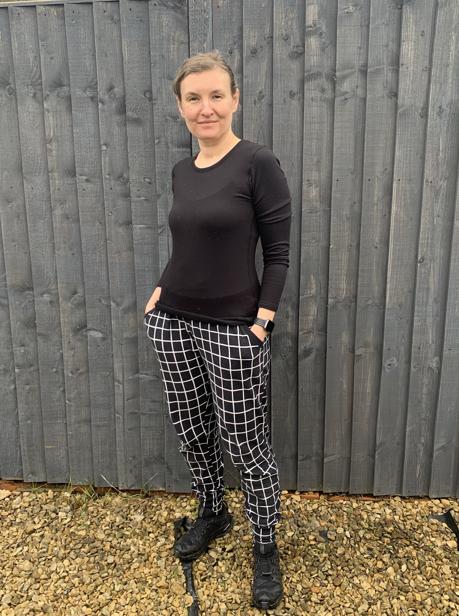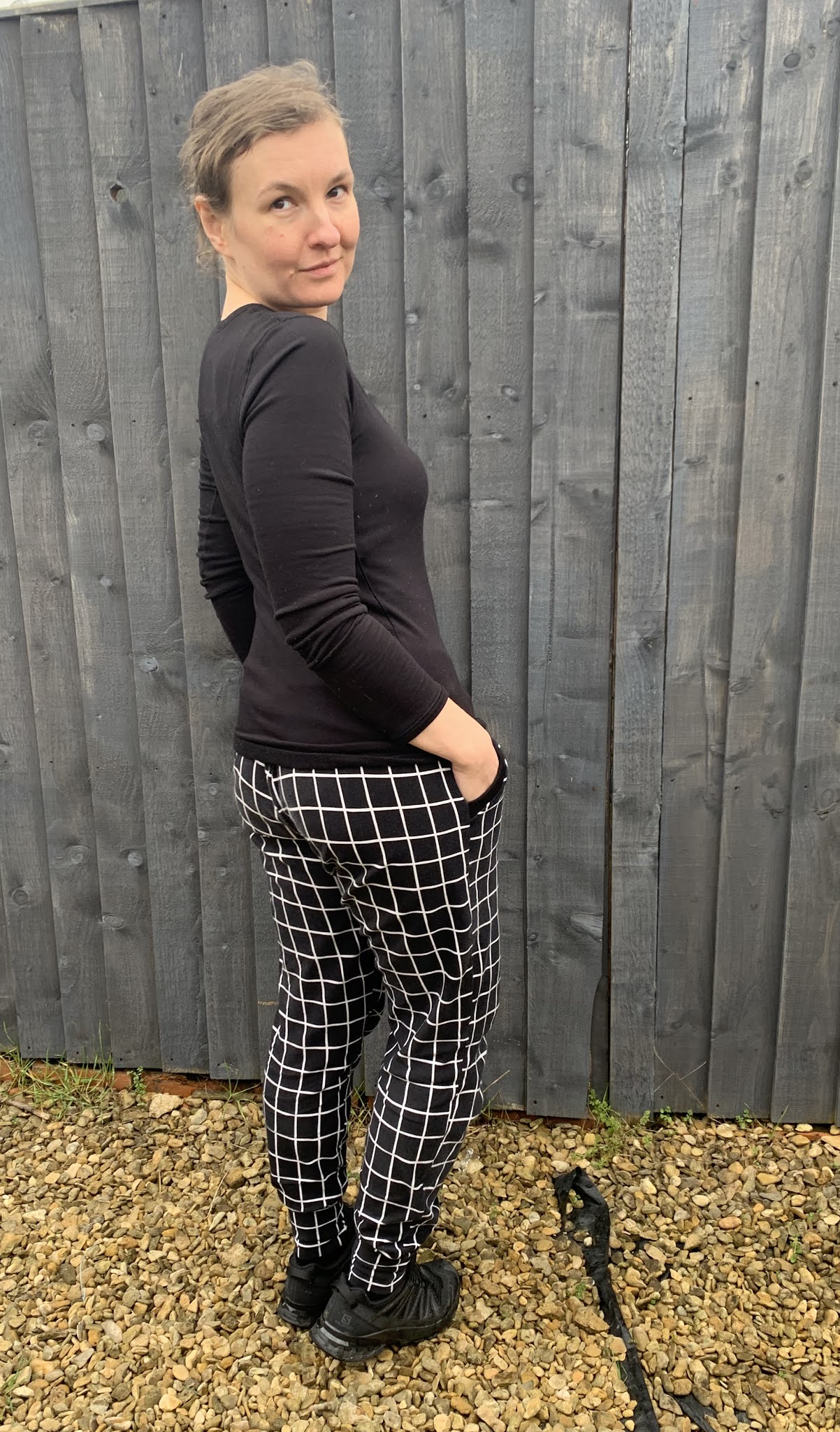 Wykrój to ponownie Hundson Pants (pokazywany już tutaj klik i tutaj klik) ale tym razem skroiłam mniejszy rozmiar. Materiał kupiłam na myfabrics.co.uk, to miękka dresówka z lekkim meszkiem od spodu, idealna na chłodniejsze dni. Nawet nie próbowałam dopasować do siebie kratki, także jest jak jest. Ściągasz w talii zrobiłam z czarnego ściągacza kupionego w dresówka.pl.