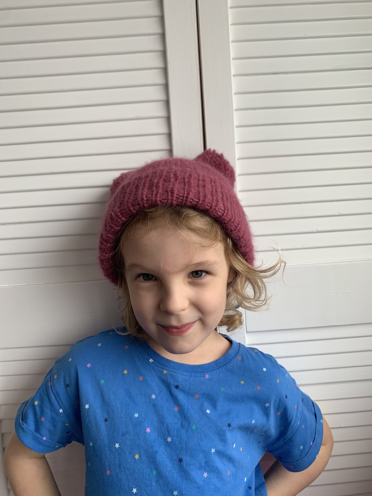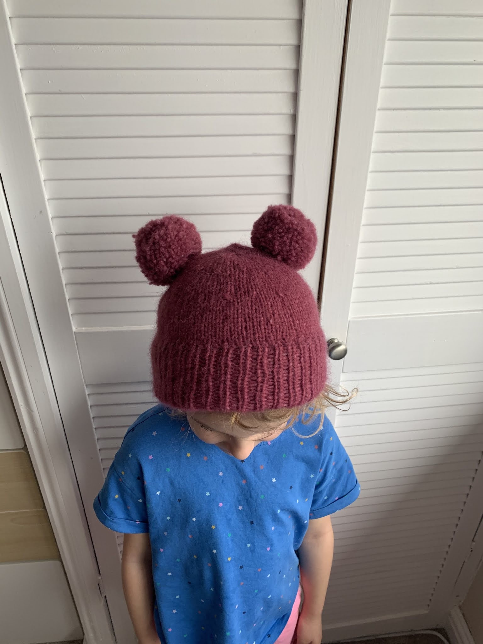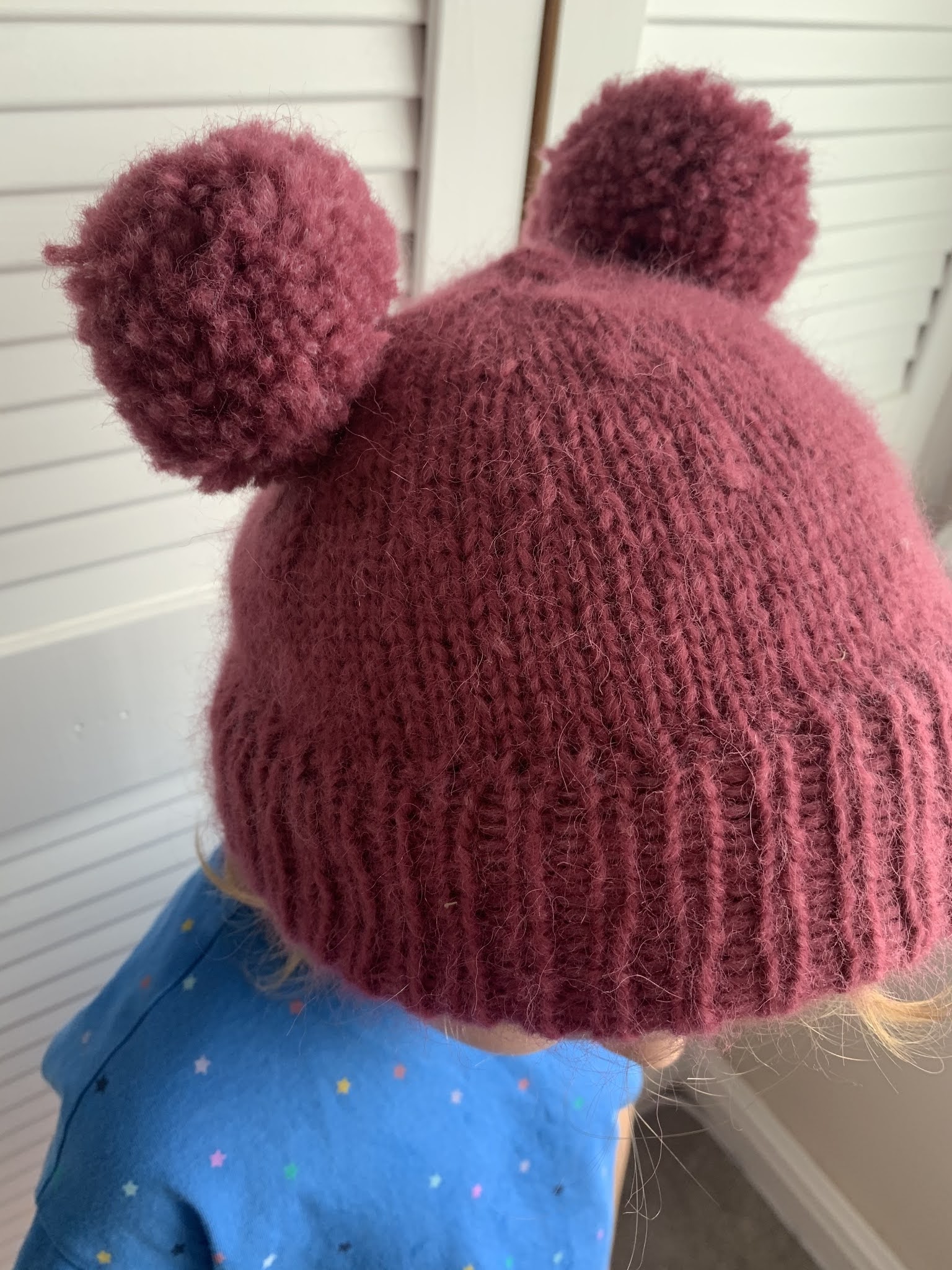 Ponieważ starsza musi na swój sweterek jeszcze chwilę poczekać (ah szycie daje jednak niemal natychmiastową gratyfikację!) to w międzyczasie machnęłam jej czapkę. Bez wzoru, zainspirowana czapką, którą widziałam w sklepie. Miała być płytka i z pomponami. Dziewczynki pomogły mi robić pompony :).