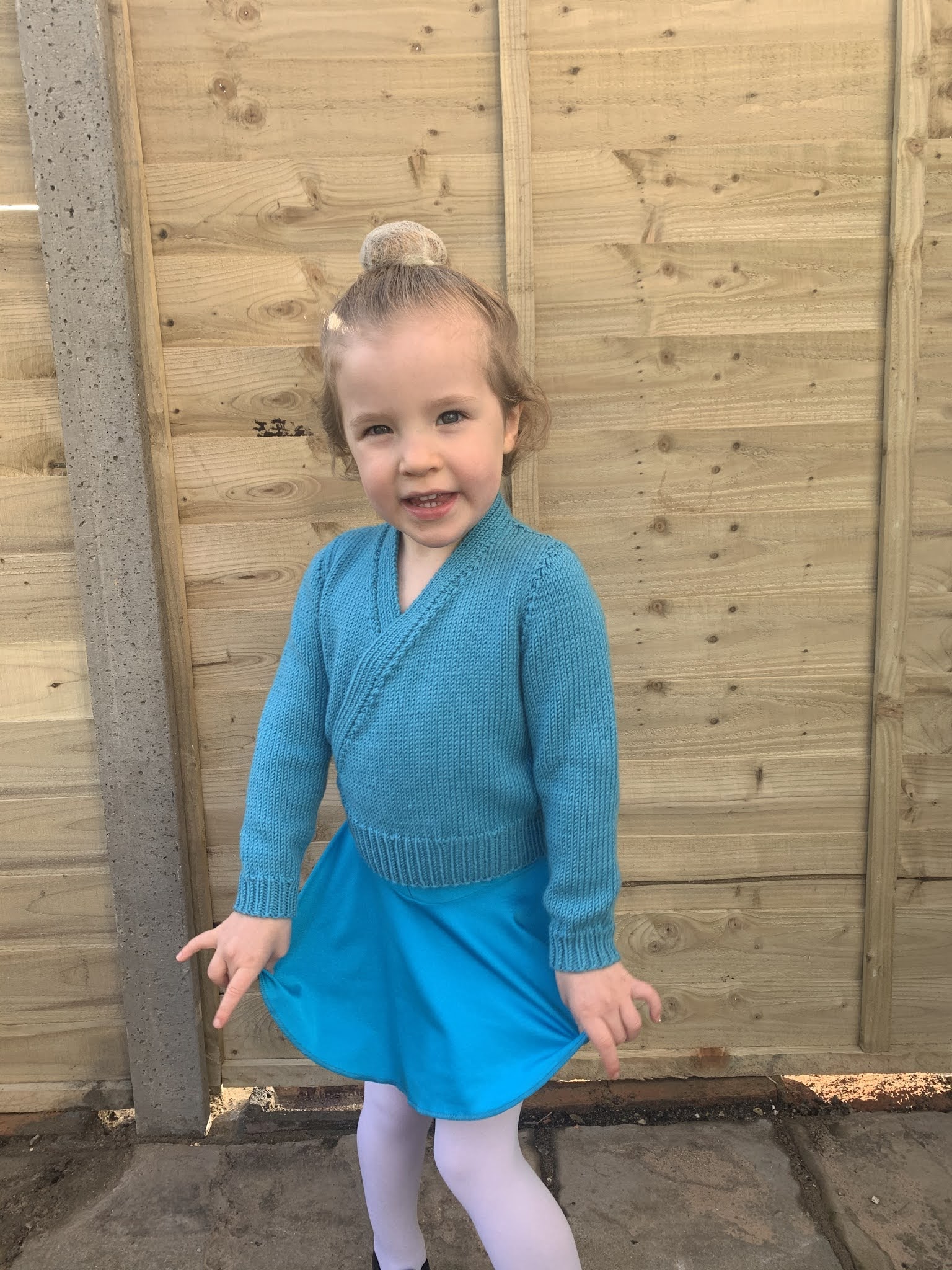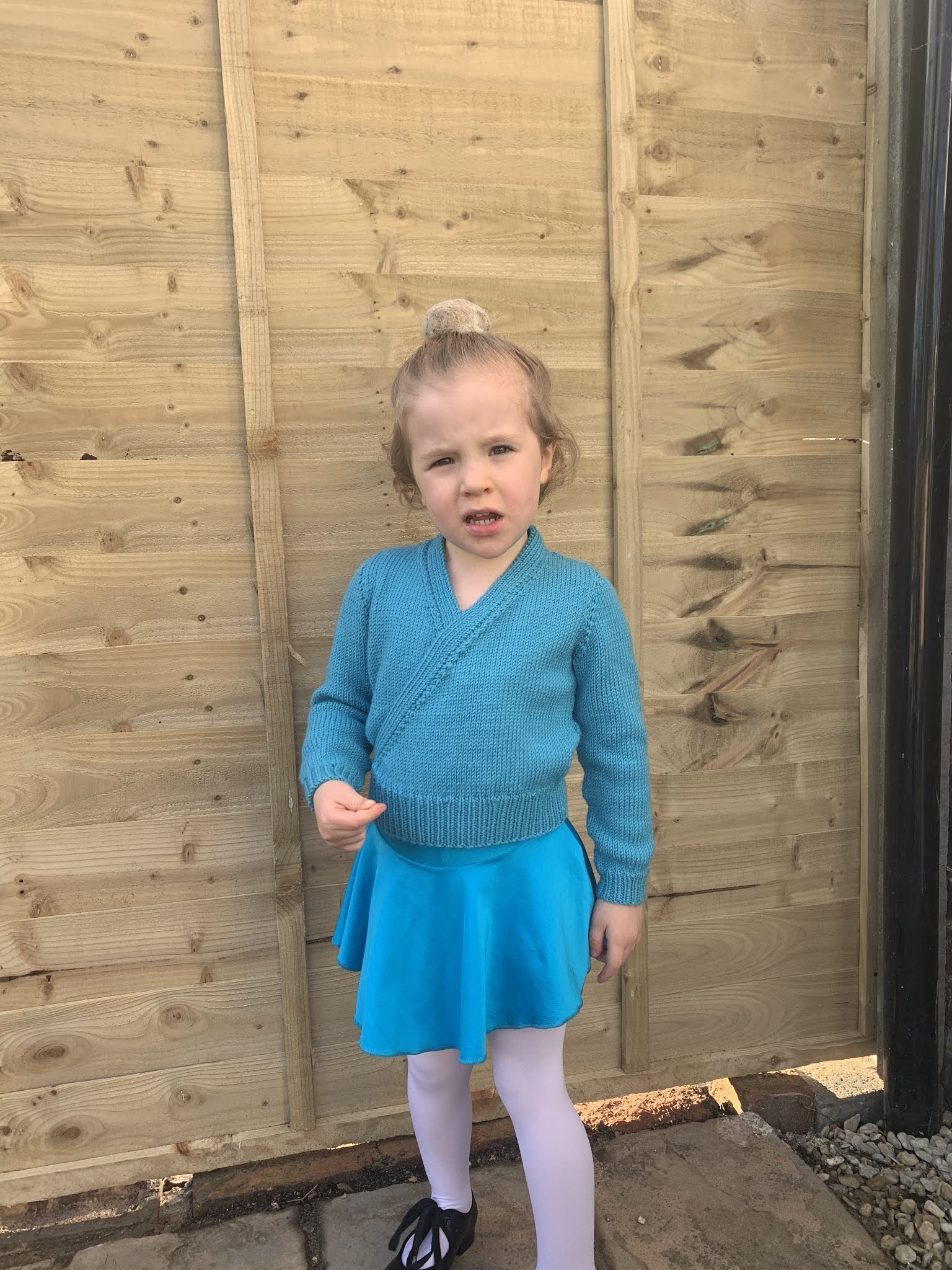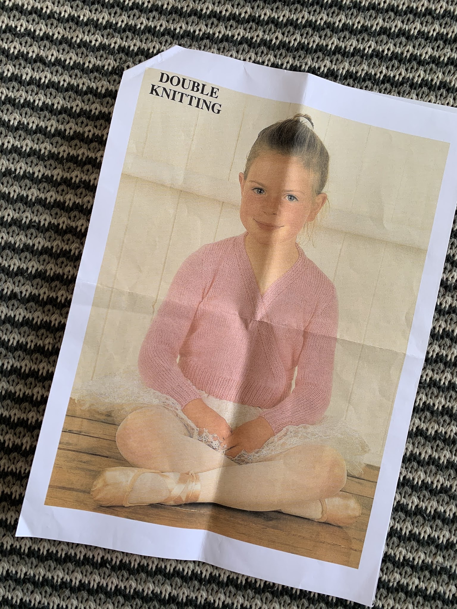 Wbrew pozorom nie jest tak łatwo znaleźć wzór na ‘ballet wrap’. Chciałam koniecznie na drutach 4mm bo miało być szybko. Ostatecznie zdecydowałam się na retro wzór od firmy Patons, kupiłam podejrzewam bardzo nielegalny skan PDF na Etsy (a może legalny bo wzór ma również retro ochronę wartości intelektualnej?). Włóczka to Drops Merino Extra Fine w kolorze sea blue, który niemal idealnie pasuje do baletowych strojów małych Pimposhek.