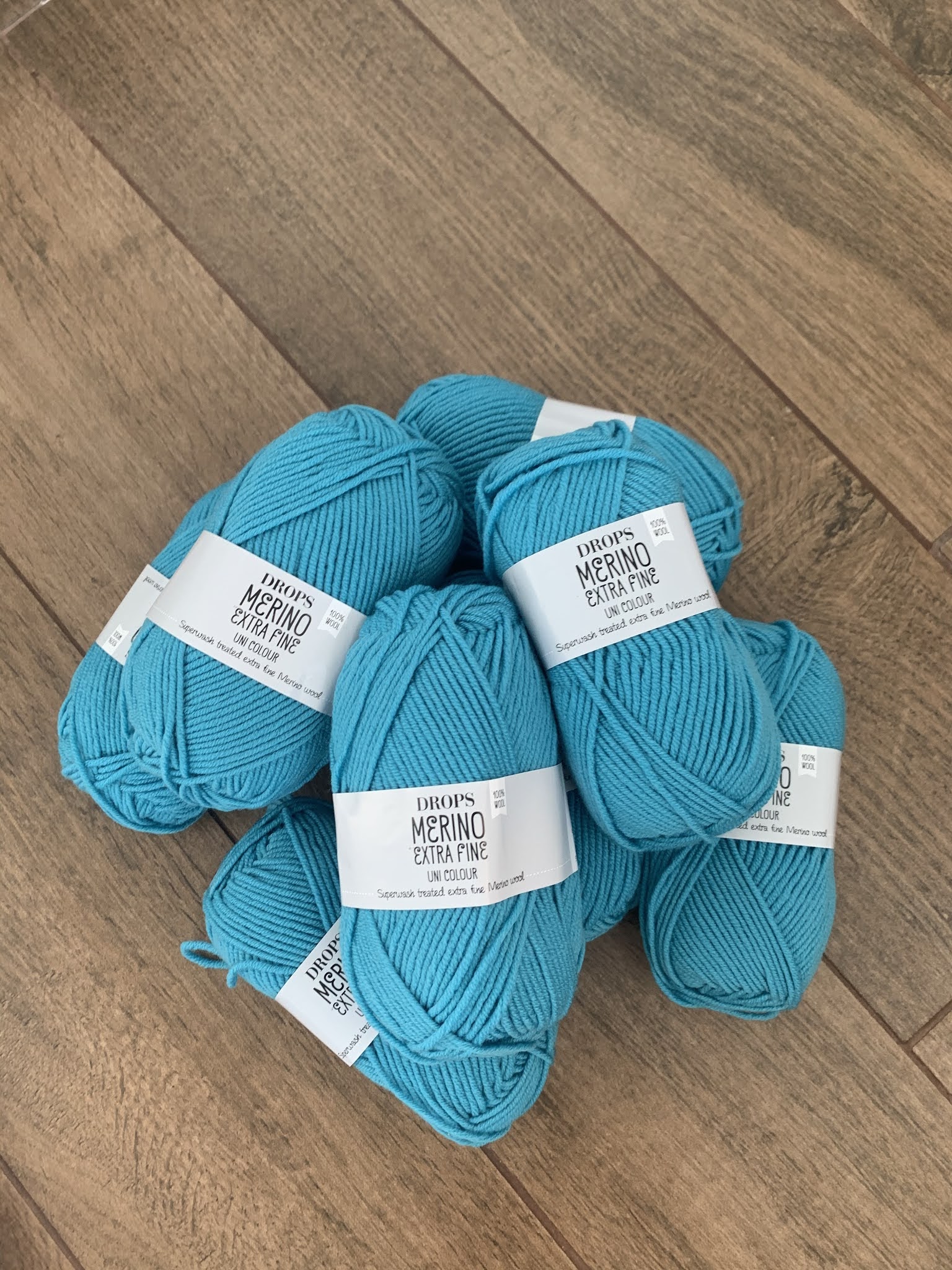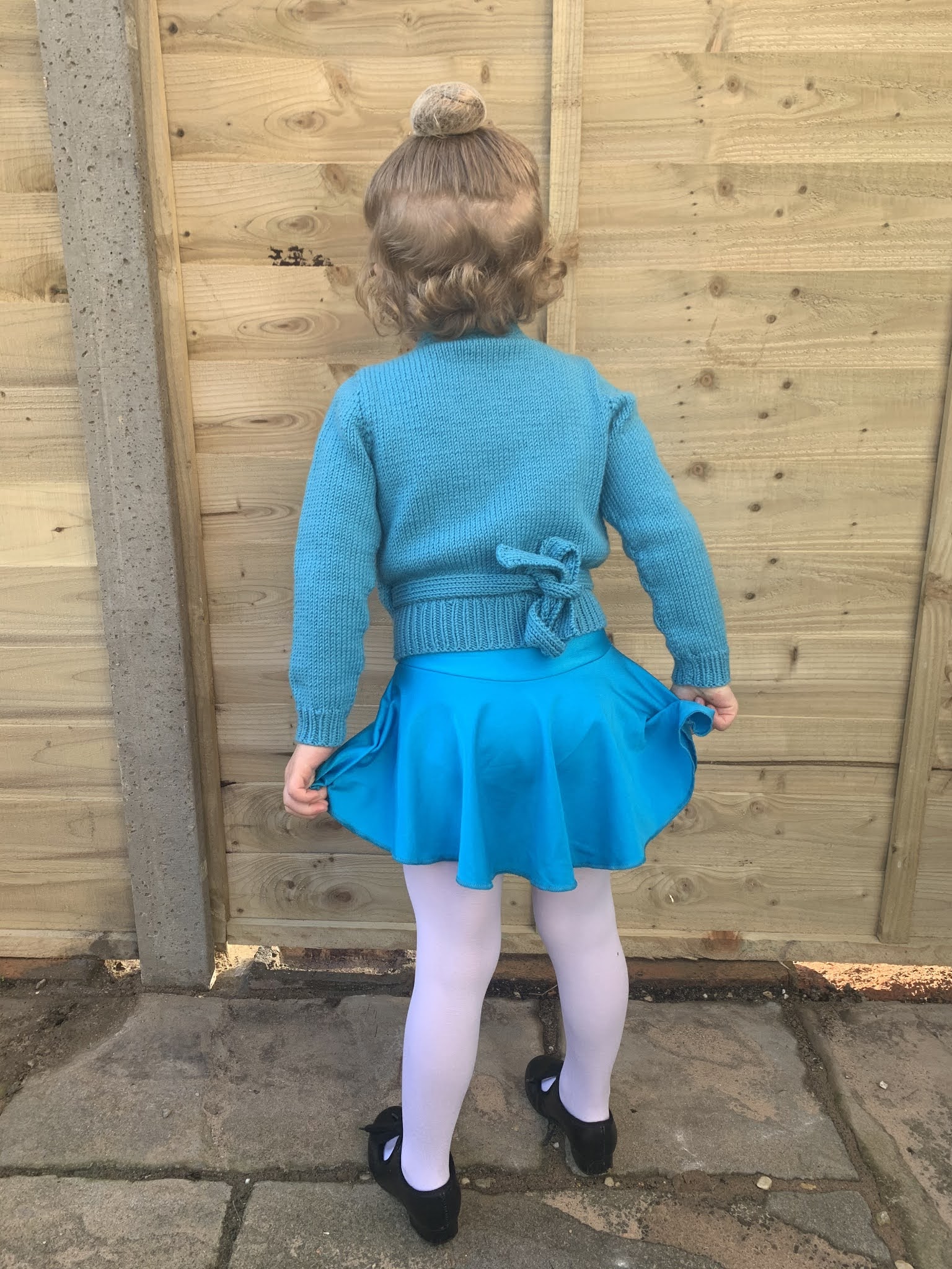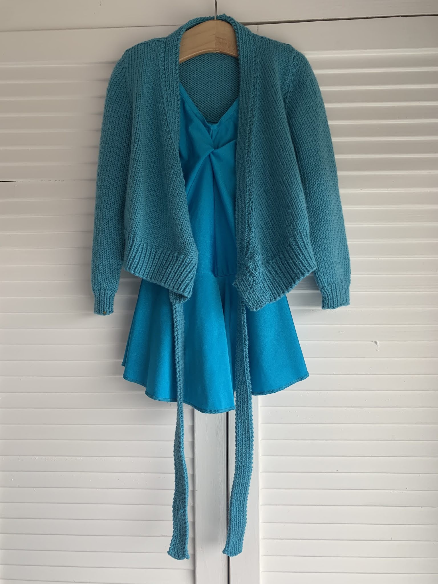 Wbrew pozorom nie jest tak łatwo znaleźć wzór na ‘ballet wrap’. Chciałam koniecznie na drutach 4mm bo miało być szybko. Ostatecznie zdecydowałam się na retro wzór od firmy Patons, kupiłam podejrzewam bardzo nielegalny skan PDF na Etsy (a może legalny bo wzór ma również retro ochronę wartości intelektualnej?). Włóczka to Drops Merino Extra Fine w kolorze sea blue, który niemal idealnie pasuje do baletowych strojów małych Pimposhek.