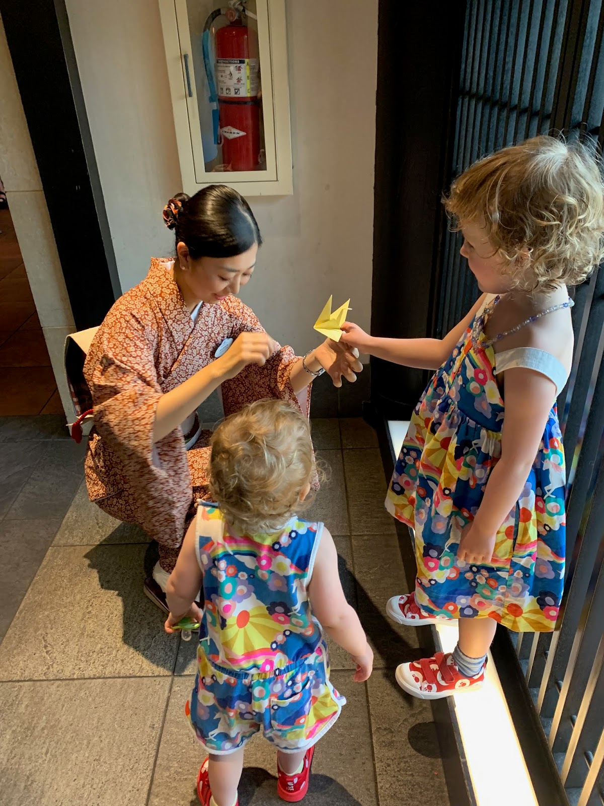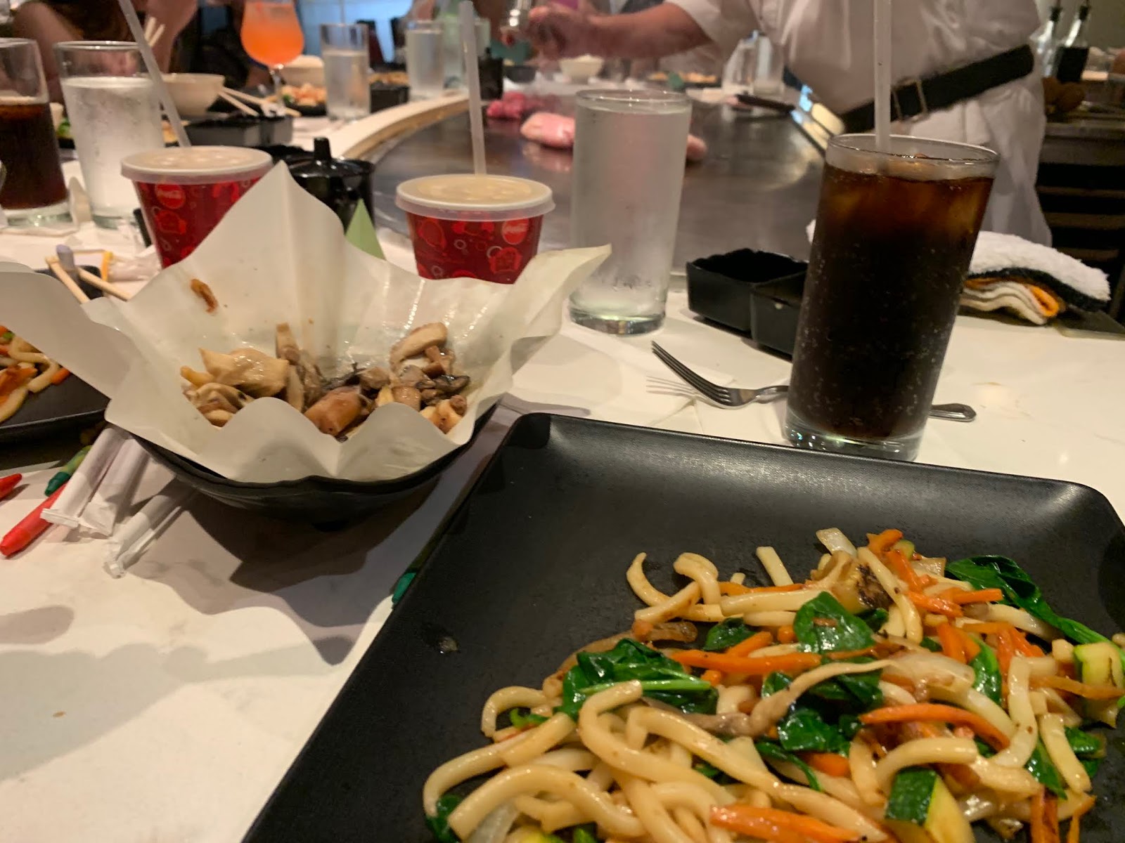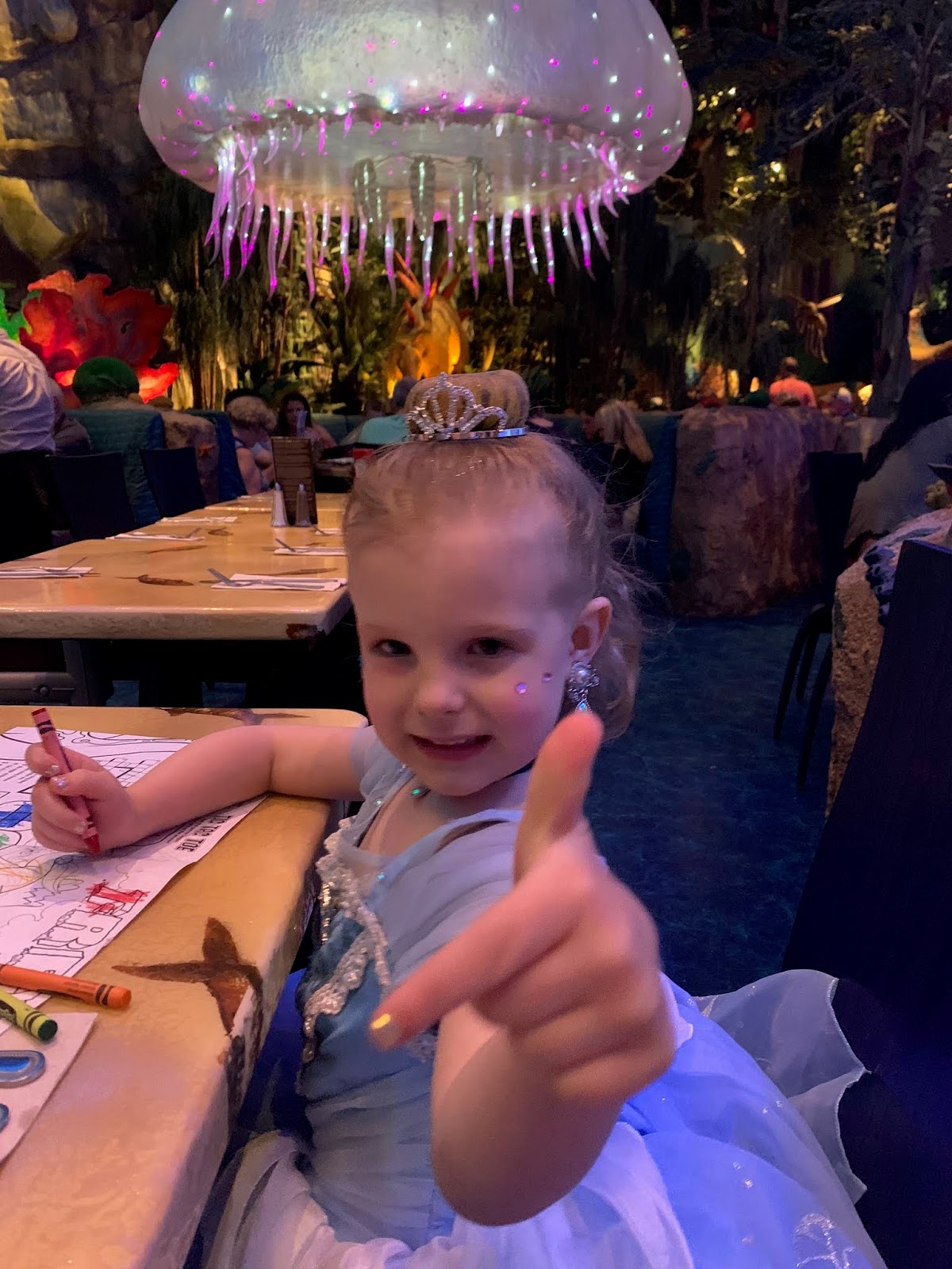 Po kilku dniach mieliśmy już system. Dzień wcześniej braliśmy z kantyny mleko i płatki, które dziewczyny zjadały rano w naszym pokoju a my jedliśmy w kantynie przed samym wyjściem do parków. Tak było zdecydowanie mniej stresująco. Resztę posiłków staraliśmy się jeść w parkach choć kilka razy zdarzyło nam się zjeść wieczorny posiłek w hotelu. W parkach było nieco lepiej bo nauczona doświadczeniem zrobiłam zwiady i miałam listę najlepszych budek i barów szybkiej obsługi gdzie warto zjeść. Kilka razy wybraliśmy się też do restauracji. W każdej było bardzo fajnie i smacznie. Zaliczyliśmy T-Rex (restaurację, gdzie je się w towarzystwie dinozaurów) oraz Jaleo (hiszpańskie tapas) w Disney Springs (restauracje w Disney Springs są godne polecenia). Zjedliśmy też kolację z widokiem w California Grill, która mieści się na dachu Contemporary resort (widok na Magic Kingdom) oraz zabraliśmy dziewczynki do Teppan Edo, restauracji w japońskim pawilonie w Epcot.