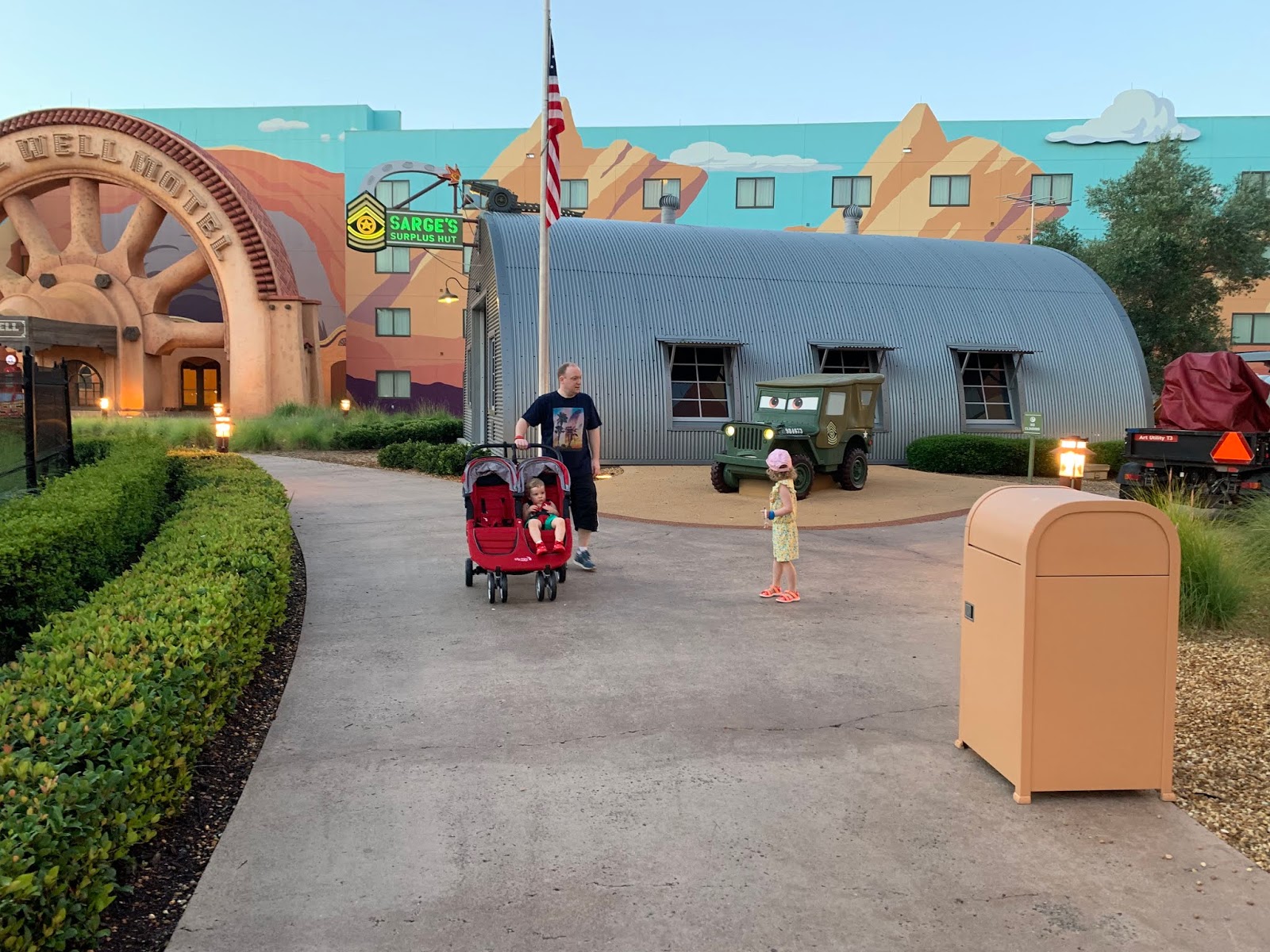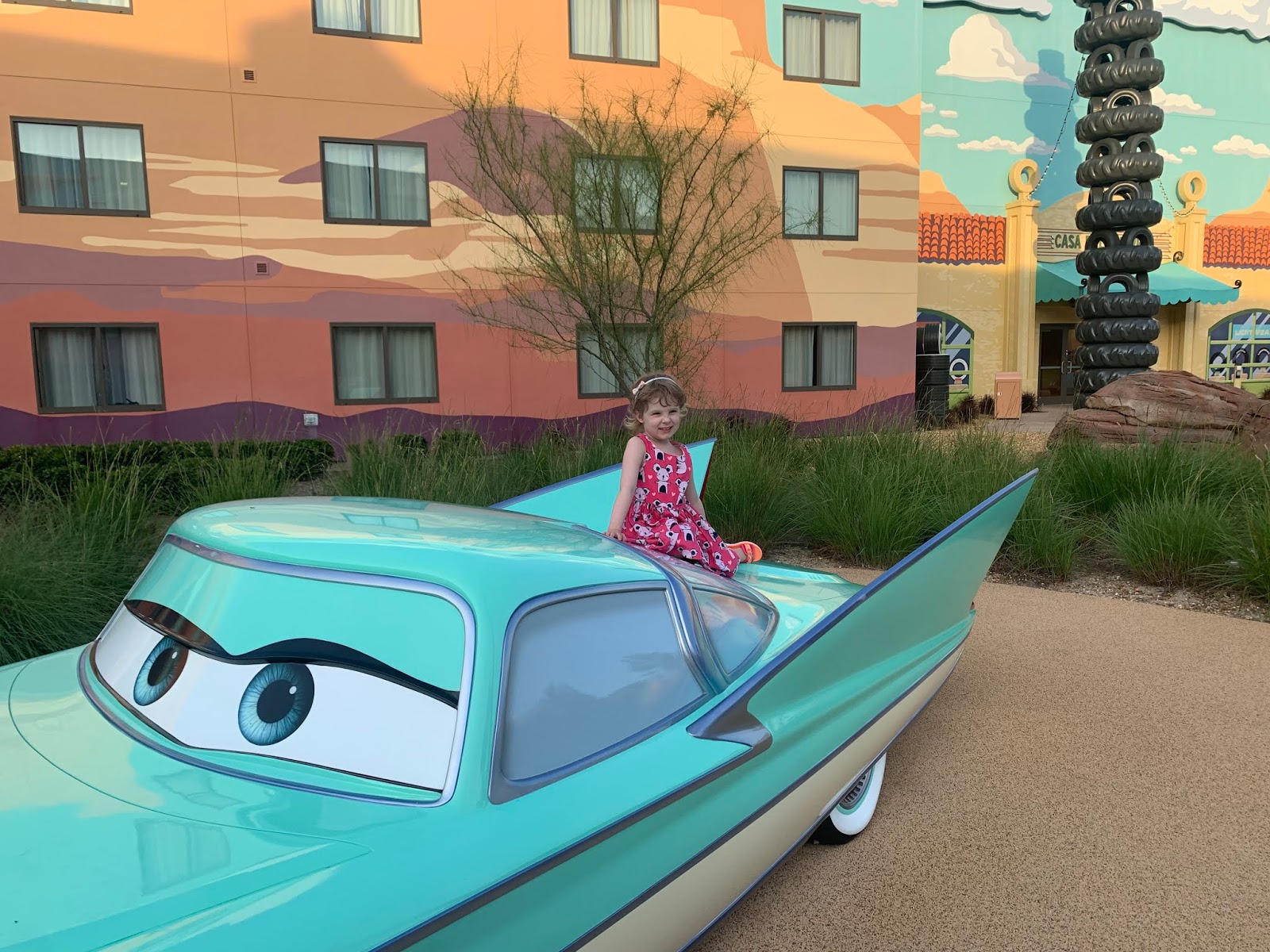 Suita jest przewidziana dla sześciu osób ale dla naszej czwórki była w sam raz. W ‘salonie’ był stół i cztery krzesła. Stół zamieniał się w łóżko ale nawet nie próbowaliśmy go rozłożyć. Nasze dziewczynki spały razem na rozkładanej kanapie, która była najwygodniejszą rozkładaną kanapą jaką miałam okazję spotkać (specjalnie zaprojektowana i wyprodukowana dla Disneya). Od zwykłej rozkładanej kanapy różniła się tym, że materac nie był na stelażu ale na ‘deskach’ w związku z czym po rozłożeniu było to jakby zwykłe łóżko. W salonie mieliśmy też mini kuchenkę z małym zlewem, ekspresem do kawy, lodówką i mikrofalówką. Dzięki temu mogliśmy przygotować dzieciom mleko rano i wieczorem a sobie zrobić poranną kawę. Dzieci miały swoją łazienkę, w której była płytka wanna idealna do kąpieli. My mieliśmy osobną sypialnię z podwójnym łóżkiem, telewizorem i osobną łazienkę z prysznicem. Pokój był codziennie sprzątany, ręczniki wymieniane itd. Nasza suita była urządzona w stylu bajki ‘Samochody’ ale były jeszcze suity urządzone w stylu ‘Szukając Nemo’ i ‘Króla lwa’ oraz pokoje w stylu ‘Małej Syrenki’. Obszar na zewnątrz naszego ‘bloku mieszkaniowego’ był również urządzony w stylu ‘samochodów’ naprawdę ktoś mógłby pomyśleć, że przeniósł się nagle do świata bajki.