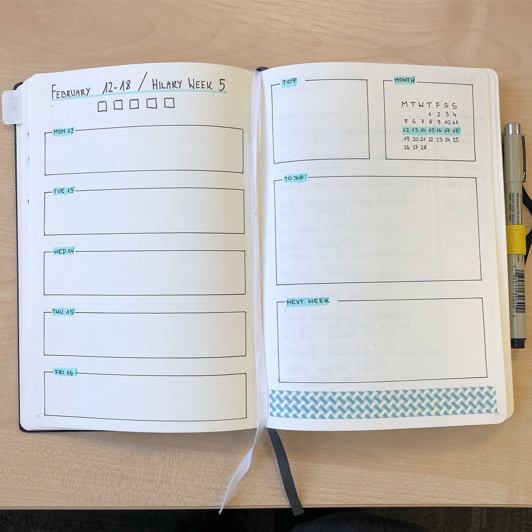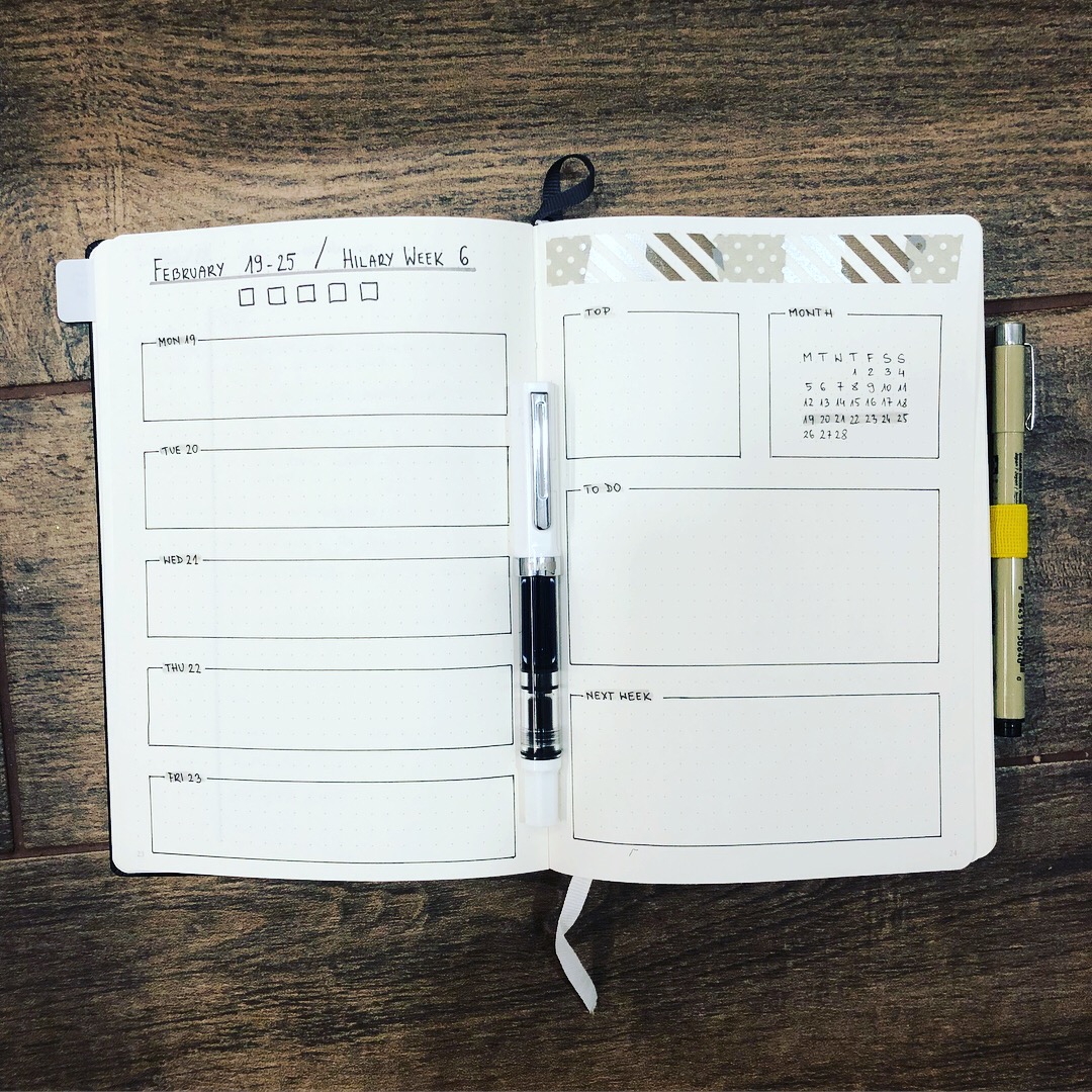 To mój pierwszy tydzień z Bujo. Nie był to produktywny tydzień w pracy bo w środę po południu dopadła mnie choroba (i nie wróciłam do pracy dopiero do wtorku) ale po wypełnieniu wyglądał tak: