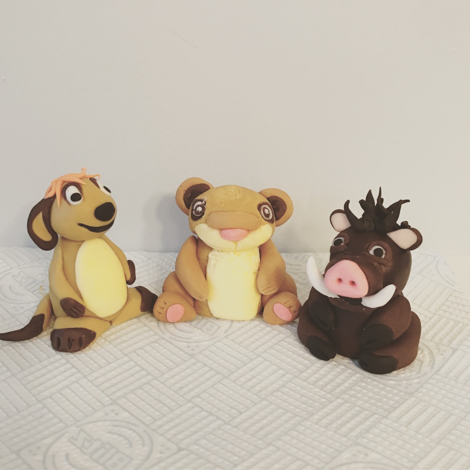 Kiedy starsza P. kończyła dwa latka postanowiliśmy spróbować swoich sił w lepieniu figurek z masy cukrowej (ja i mąż). Tym razem zamówiliśmy tort w pracowni tortowej ale bez figurek. Za sam tort z napisem i brzegiem ozdobionym liśćmi palmy (tematem tortu był tym razem Król Lew) zapłaciłam 65 funtów. A każda figurka to dodatkowy wydatek ok 20-25 funtów. Ulepiliśmy Simbę, Pumbę i Timona. Simba wyglądał bardziej jak miś a z tego wszystkiego Timon wyglądał najbardziej przyzwoicie. Z Simby zrezygnowaliśmy i na torcie pojawili się tylko Pumba i Timon. Tym razem moja koleżanka również przyszła z pomocą i zrobiła dla mnie Pumbę.