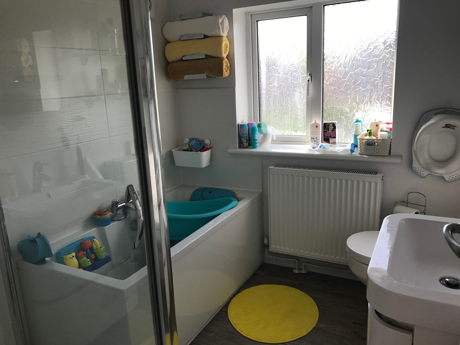 Następna w kolejności była łazienka, kiedy zaczęło nam kapać na głowę. Uwielbiam naszą dużą kabinę prysznicową i malutką wannę, w sam raz dla dziewczynek.