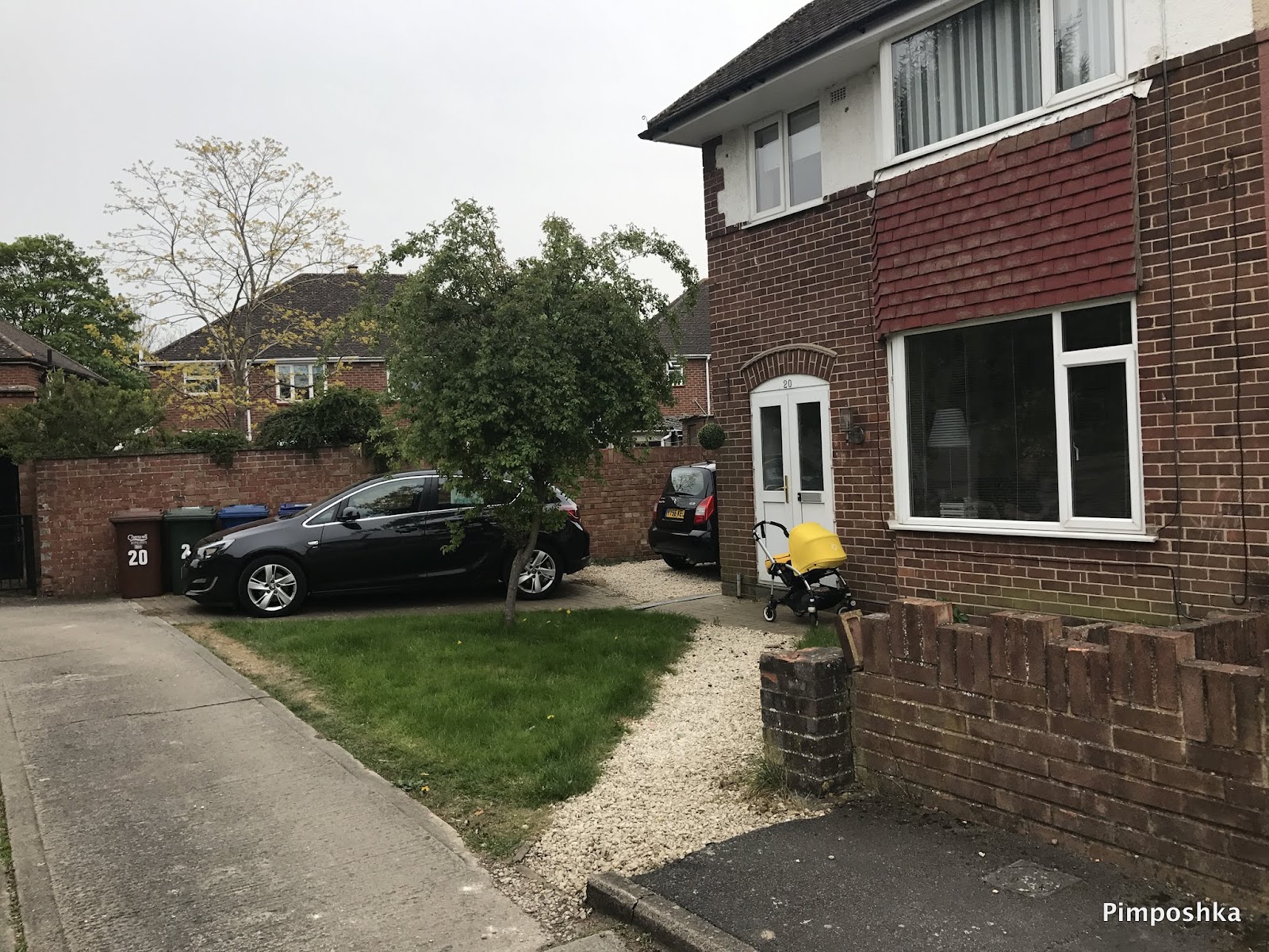 Wzdłuż domu mamy dwa miejsca parkingowe, jedno na polbruku a drugie na żwirze. Przy furtce do ogrodu widać worek z balastem, który pozostał po fundamentach pod szopę. Sami nie jesteśmy go ruszyć a trochę bardzo 😉 psuje widok. Na trawie przed domem mamy małe drzewko.