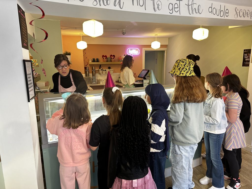Przyjęcie było w małej lokalnej lodziarni. Trwało półtorej godziny. Dzieciaki mogły udekorować swój własny deser lodowy z trzech gałek, było lodowe bingo, konkurs na najlepszy rysunek deseru lodowego oraz robienie zakładki do książki. Pani prowadząca miała wprawę, wyszło ok.