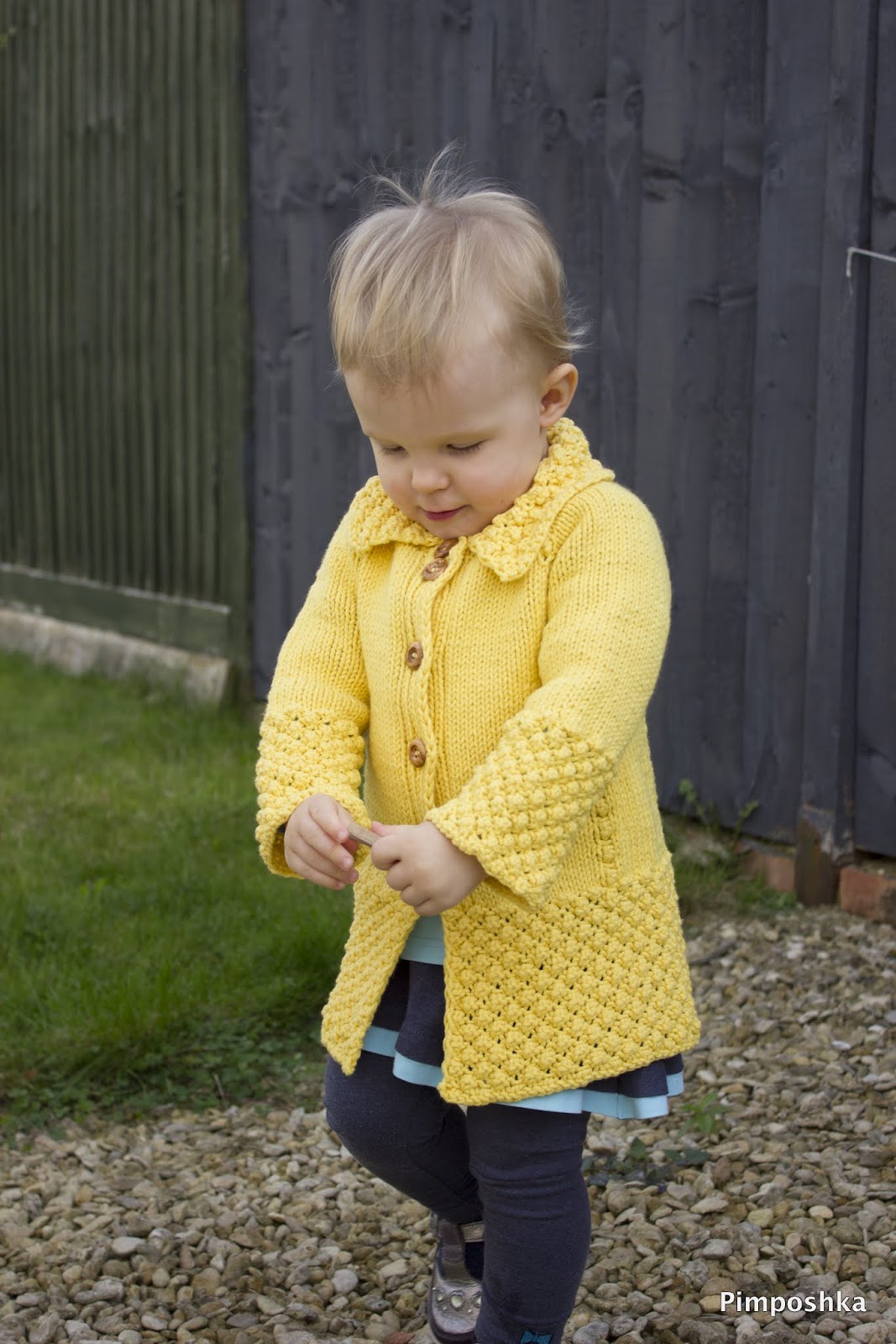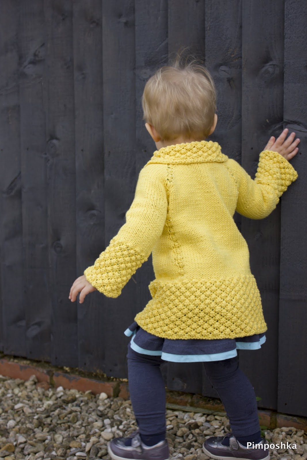 Nareszcie mogę Wam pokazać skończony płaszczyk dla małej P. Dziergałam go od Lipca a jak już wydziergałam to gadzina schła dwa dni i martwiłam się, czy uda mi się zrobić sesję w ten weekend. No ale udało się, więc oto efekty: