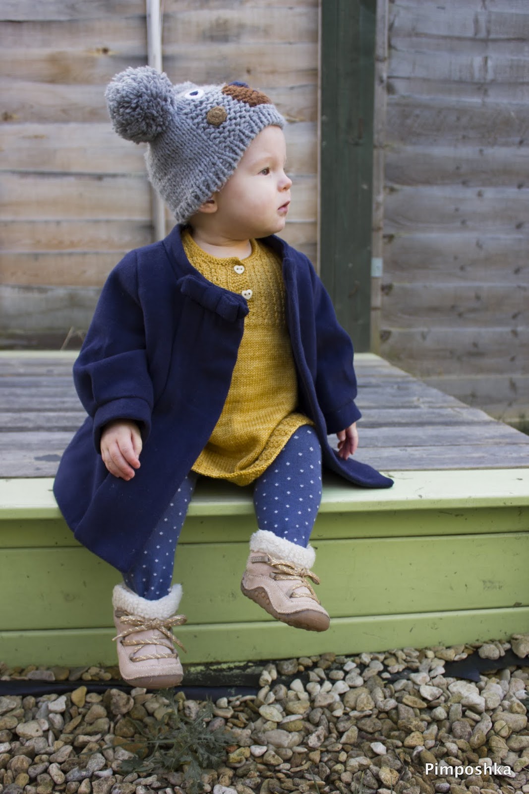 Śliczna ta sukienka! 🙂 Małej bardzo w nim do twarzy, i chyba też wygodnie. Kolor jest ślicznie komponuje się z granatowym płaszczykiem.