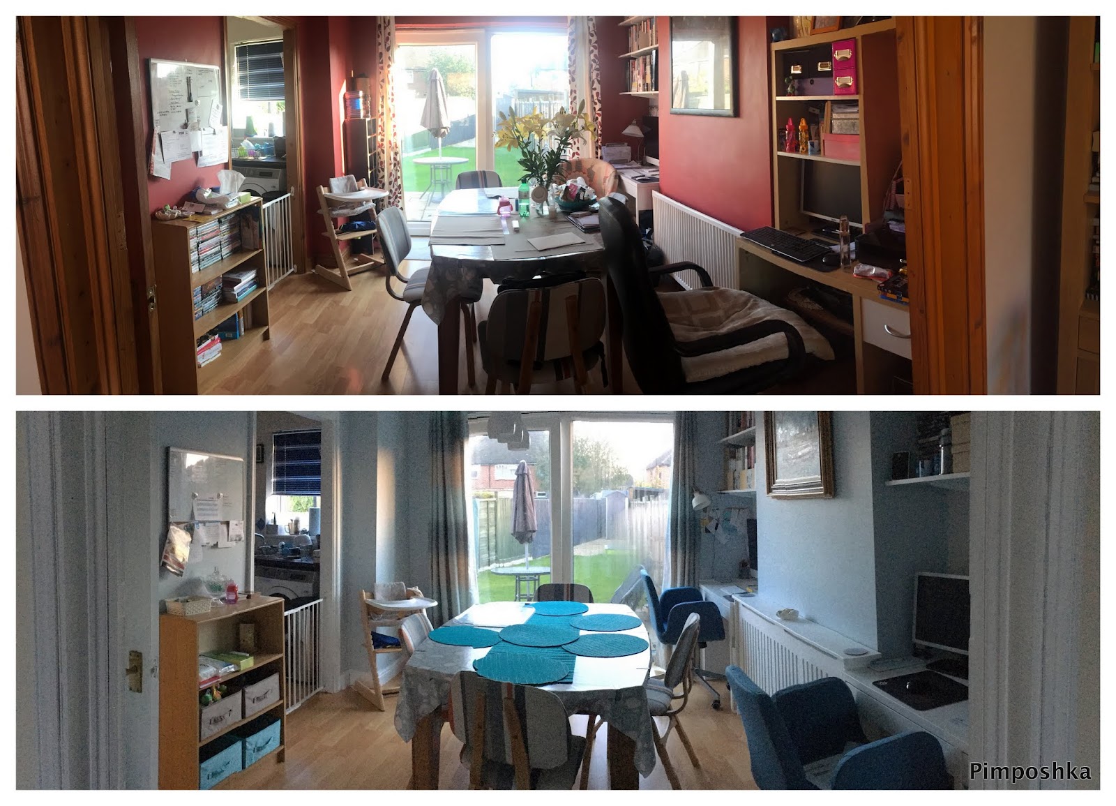 Jadalnia była buraczkowa, teraz jest szaro-błękitna. Padło pytanie skąd mamy krzesła stołowe. Kupiłam je na e-bayu były pokryte czarnym skajem i sama zmieniłam im tapicerkę. Wystarczy wpisać ‘mid-century dining chairs’ i wyskakuje sporo podobnych opcji 🙂